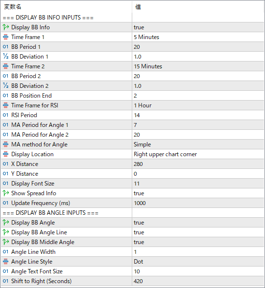 このインジケータを使用することによりボリンジャーバンドの幅や、幅の広がりの割合、バンドの角度を視覚化することにより、