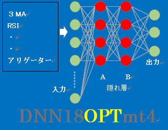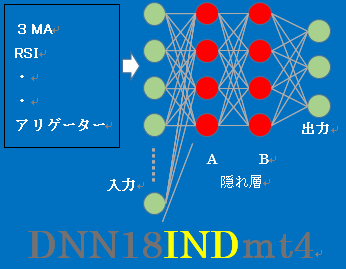 DNN18、ディープ・ニューラルネットワーク(DNNと略称)を用いて専門知識なく18個のインジケーターを自由に組み合わせ、OPENCLOSE信号を出力します。DNNは入力層、隠れ層AB、出力層の4層です。