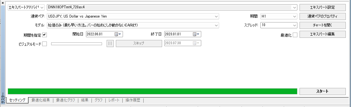 【OPTを即実行したい】商品に添付してるファイル「DNN18OPTmt4_720.set」をエキスパート設定>パラメーターの入力から読み込んでください。そして下の「1.」「4.」を実行してください。最適化を実行します。