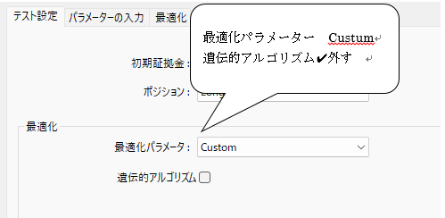 〇「カスタム選択」:OPT独自のGAの評価、OnTesterの計算方法の選択。