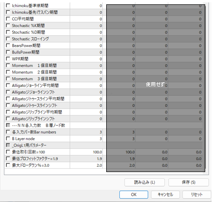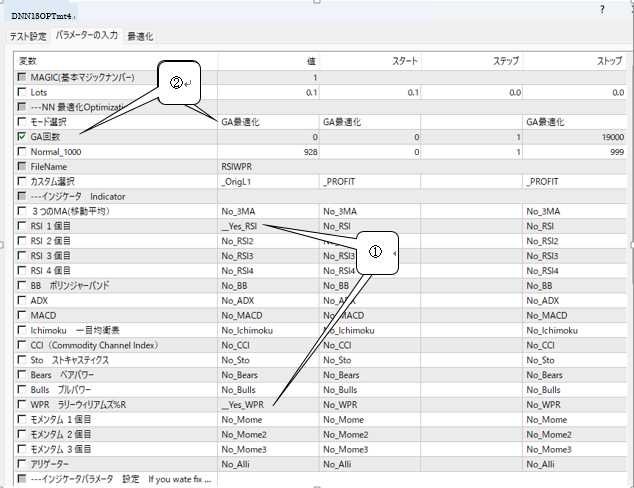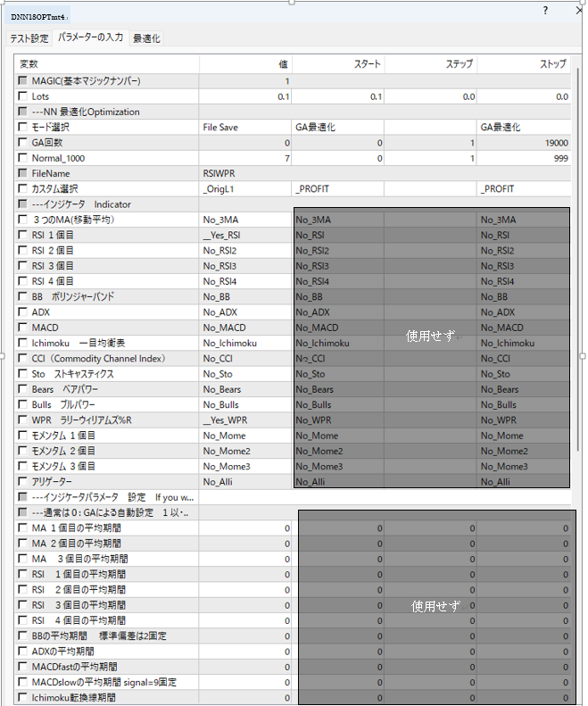 以下は期間パラメーター等を設定したい場合、数値を入力します。0の場合、DNN18のGAが最適化した値となります。無論、インジケーターがYesになっていないと無意味です。