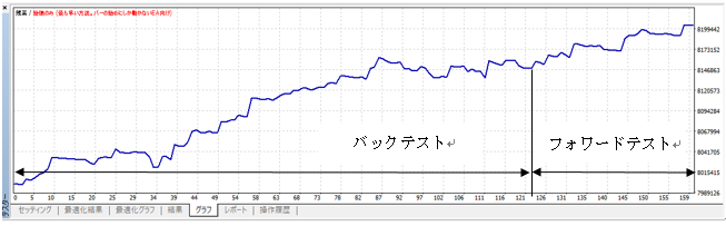まず最下の最適化結果メニューをクリックします。選択方法はお好みですが、最適化結果のプロフィットファクタ(もしくはOnTester)を大きい順にならべ、期間が約1年なので最低3桁の行をダブルクリックします。(最適化外して)スタートをクリックしてグラフメニューにします。幾つか選択してみてよさそうな中から1つ選択します。