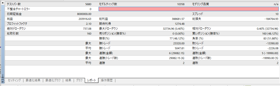 〇「最低取引回数=100」:最低取引回数を設定します。必ずこの数値以上に結果がなるという訳ではなく、この値以上となる可能性が大きいという設定です。初期値100。高すぎる値もしくはそのようなケースが不可能な場合でも、それなりの最適値を出力します。