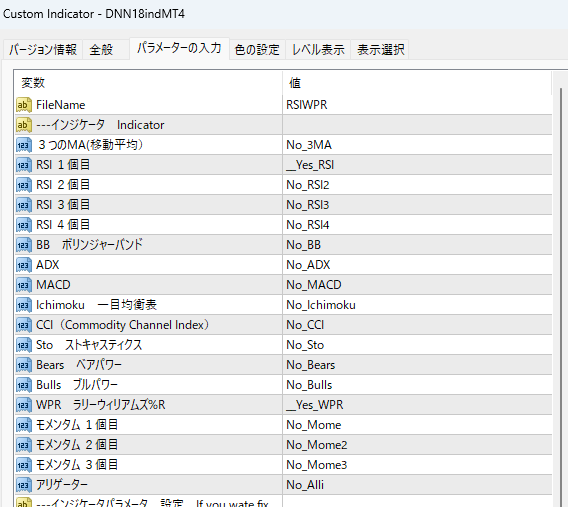 あとは他商品のインジケーターと同様です。則、動作させたいなら何もいじりません。OPTのパラメーターを変更したなら、「パラメーターの入力」をOPTと同じに設定し直します。OPTと同じにすれば問題ありません。(面倒な場合、OPTのパラメーターを一度保存し、それをINDのパラメーター設定で読み込んでください。)既定値はFileNameがRSIWPRRSI,WPRYesに設定しています。