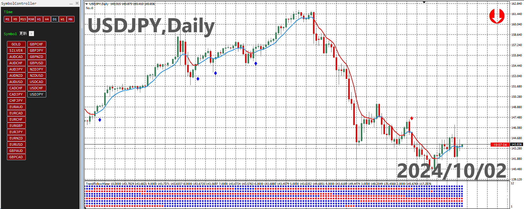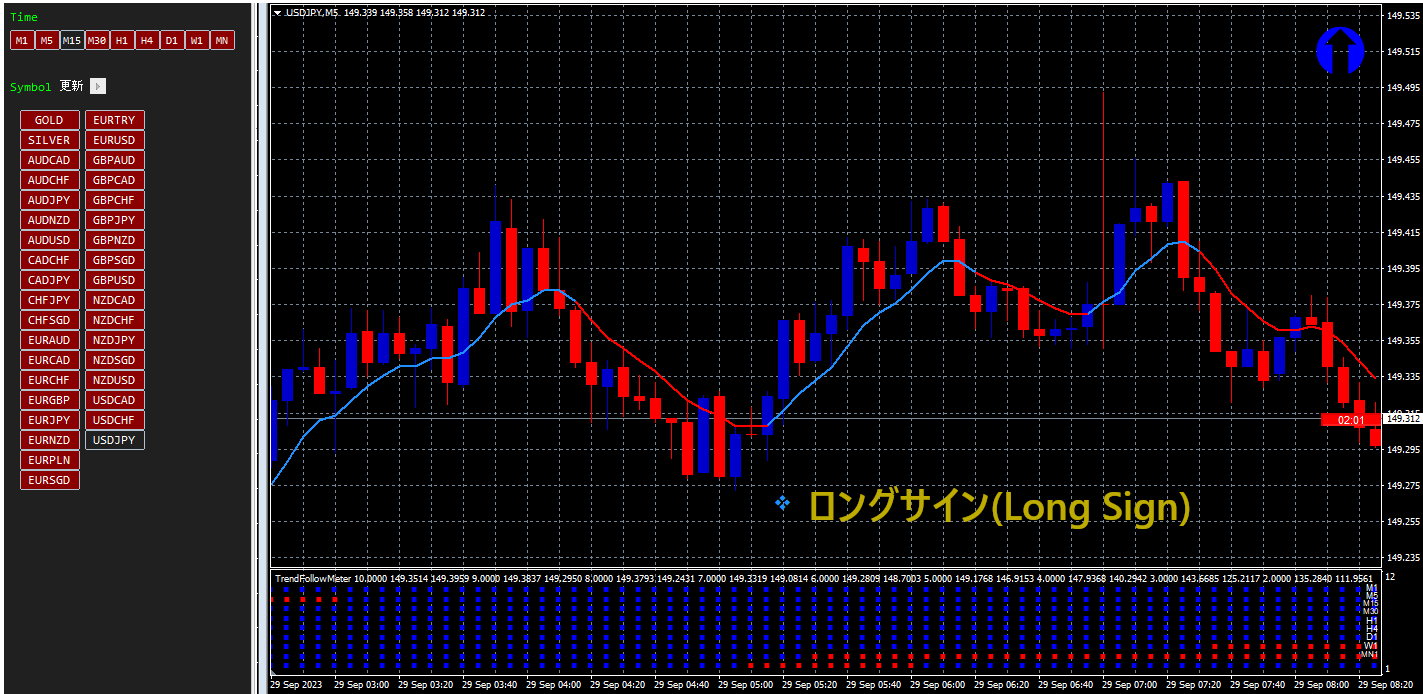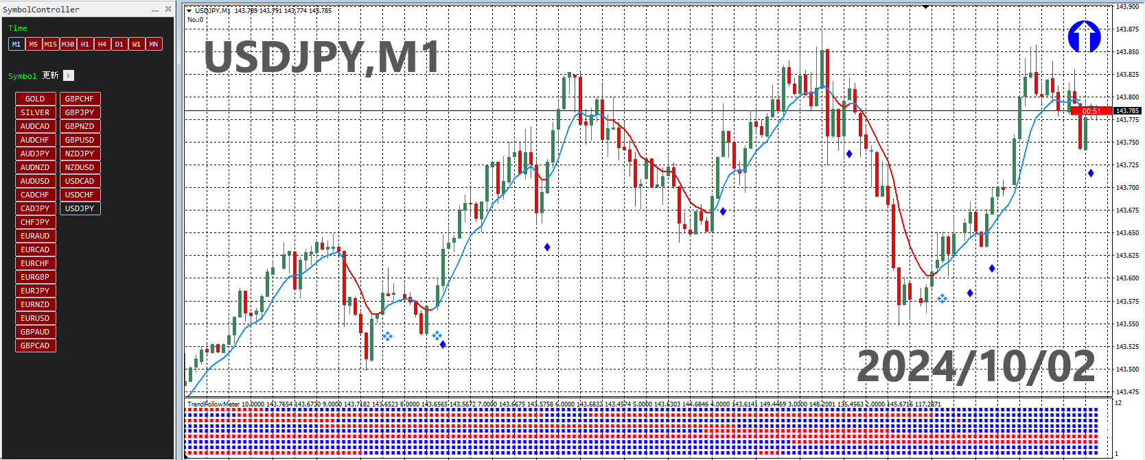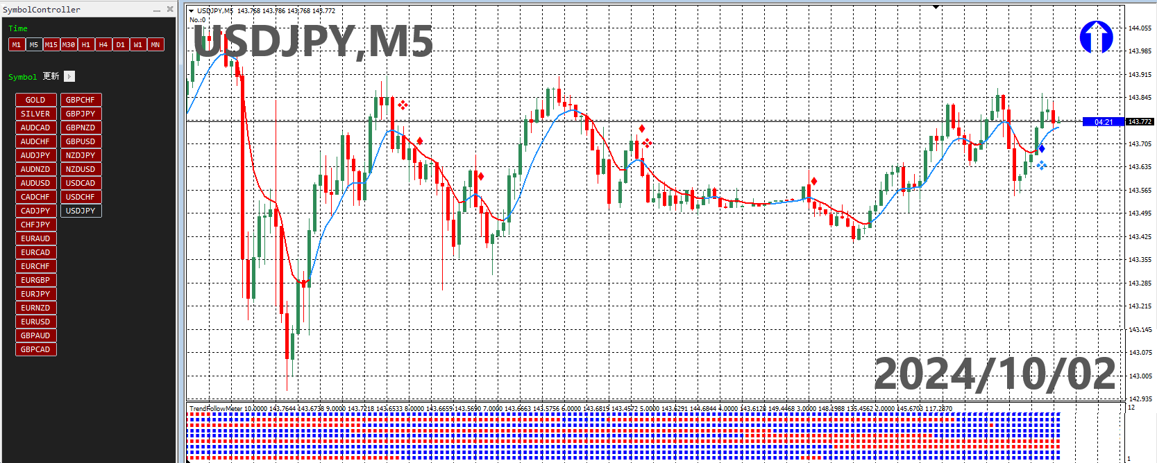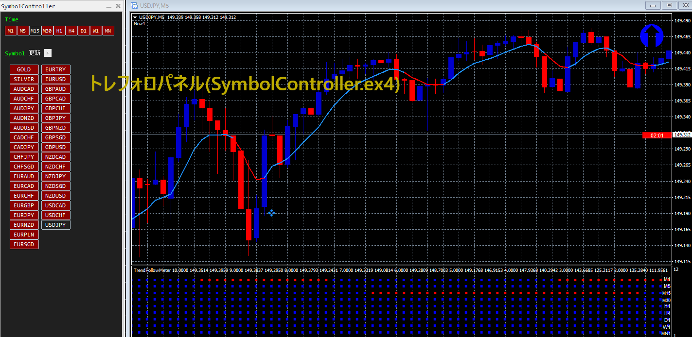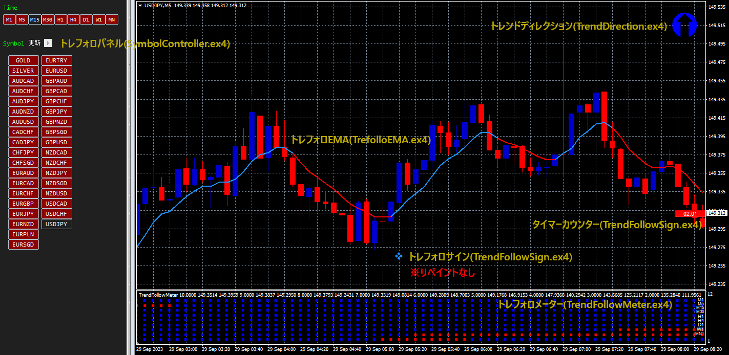 相場の押し目でサインを出してくれるインジケーター。 ・トレンドディレクション(TrendDirection.ex4) 表示している時間軸の目線が上なのか下なのかを可視化するインジケーター ・トレフォロメーター(TrendFollowMeter.ex4) 全時間軸の目線を表示してくれるオシレーター