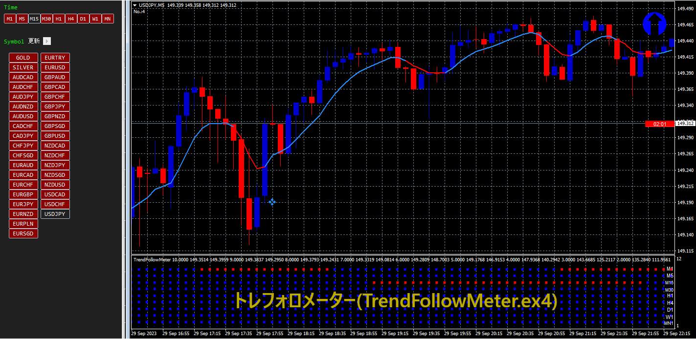 トレフォロパネルは、簡単に通貨ペアを切り替えられるインジケーターです。MT4で複数のチャートを表示している場合でも一括で通貨ペアを変更することができます。