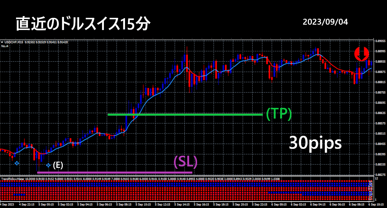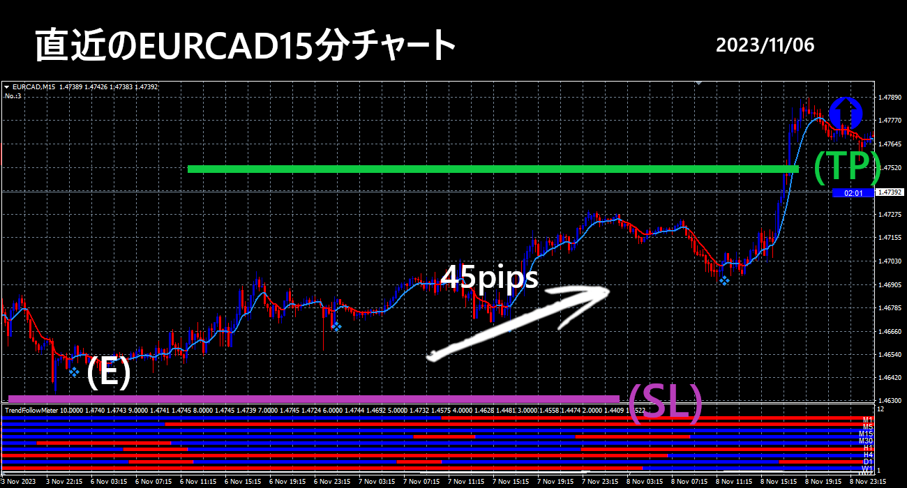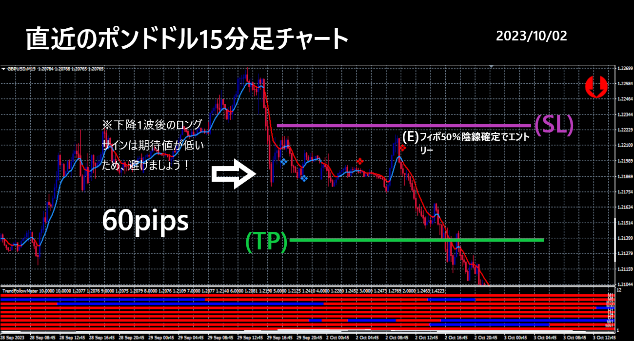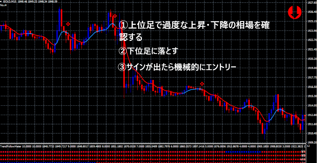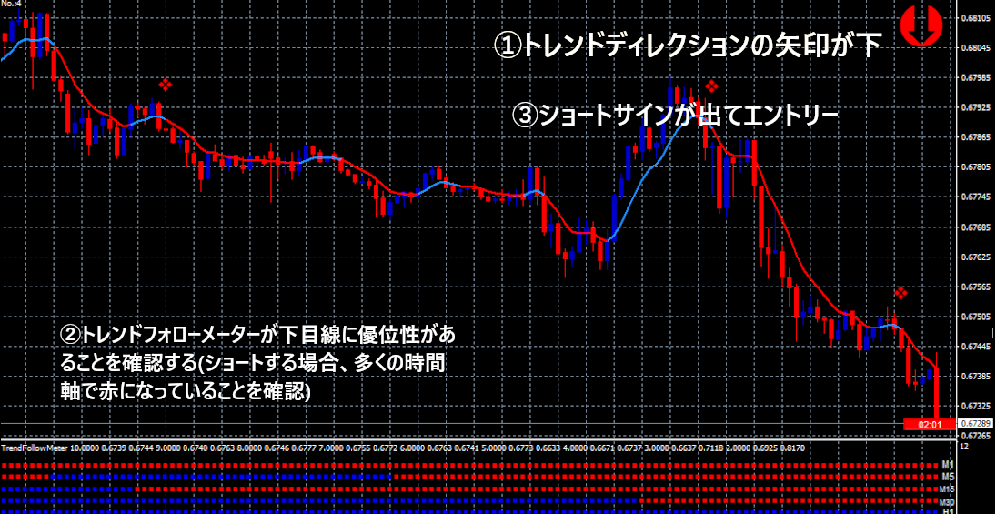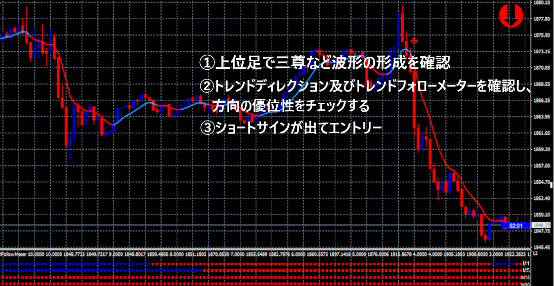 1.上位足で三尊などの波形を形成 2.下位足に落としてトレンドディレクション及びトレンドフォローメーターを確認 3.サイン点灯でエントリーを検討する