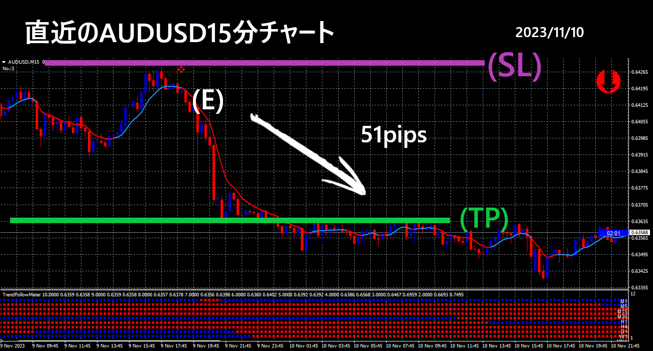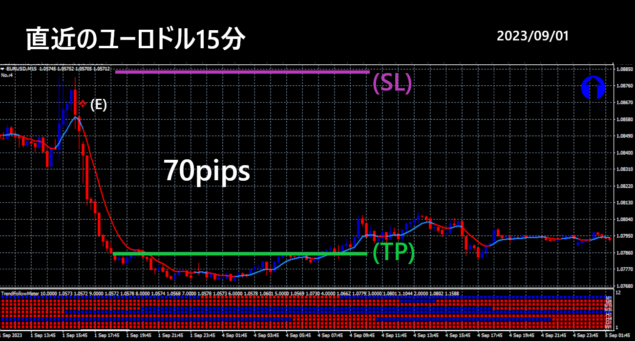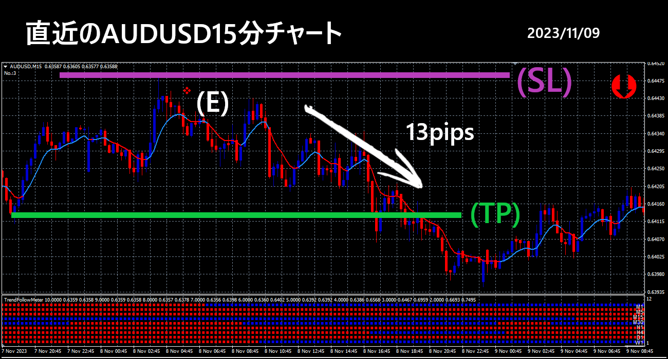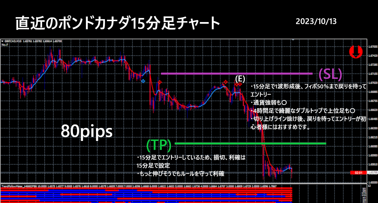 1.上位足で三尊などの波形を形成 2.下位足に落としてトレンドディレクション及びトレンドフォローメーターを確認 3.サイン点灯でエントリーを検討する