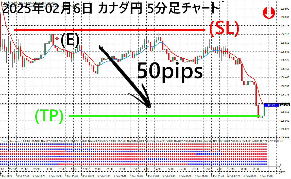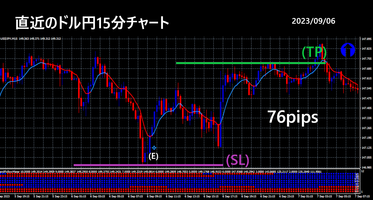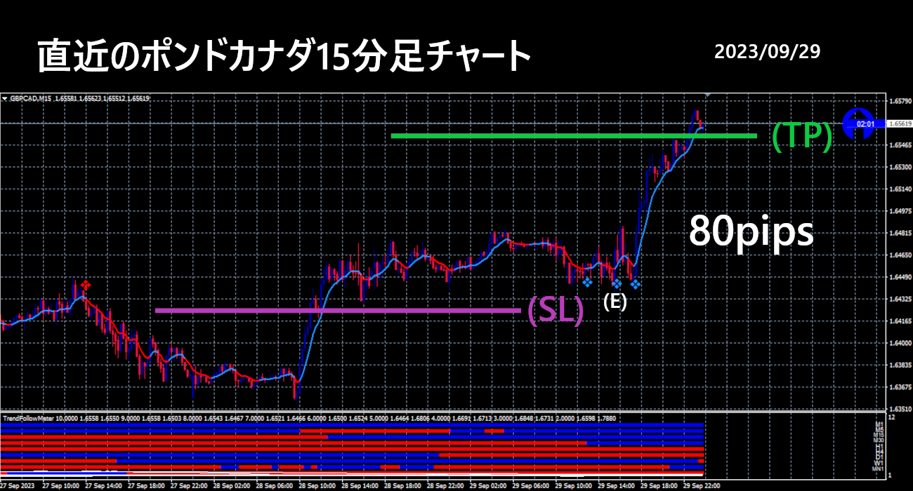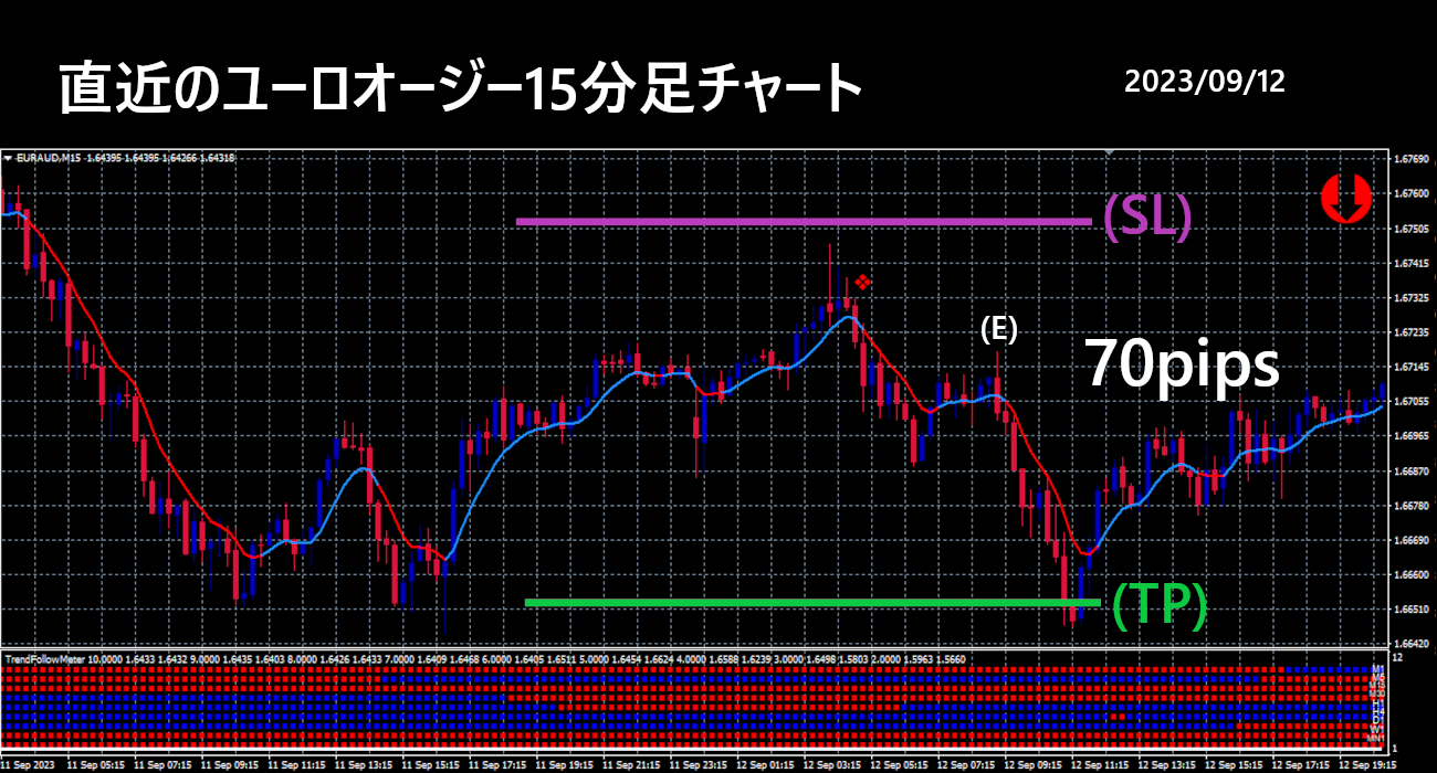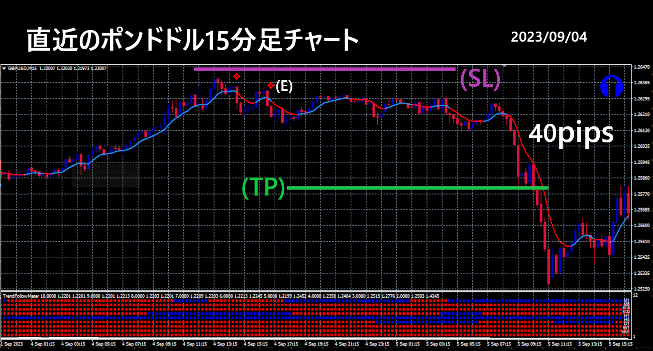 1.上位足で三尊などの波形を形成 2.下位足に落としてトレンドディレクション及びトレンドフォローメーターを確認 3.サイン点灯でエントリーを検討する