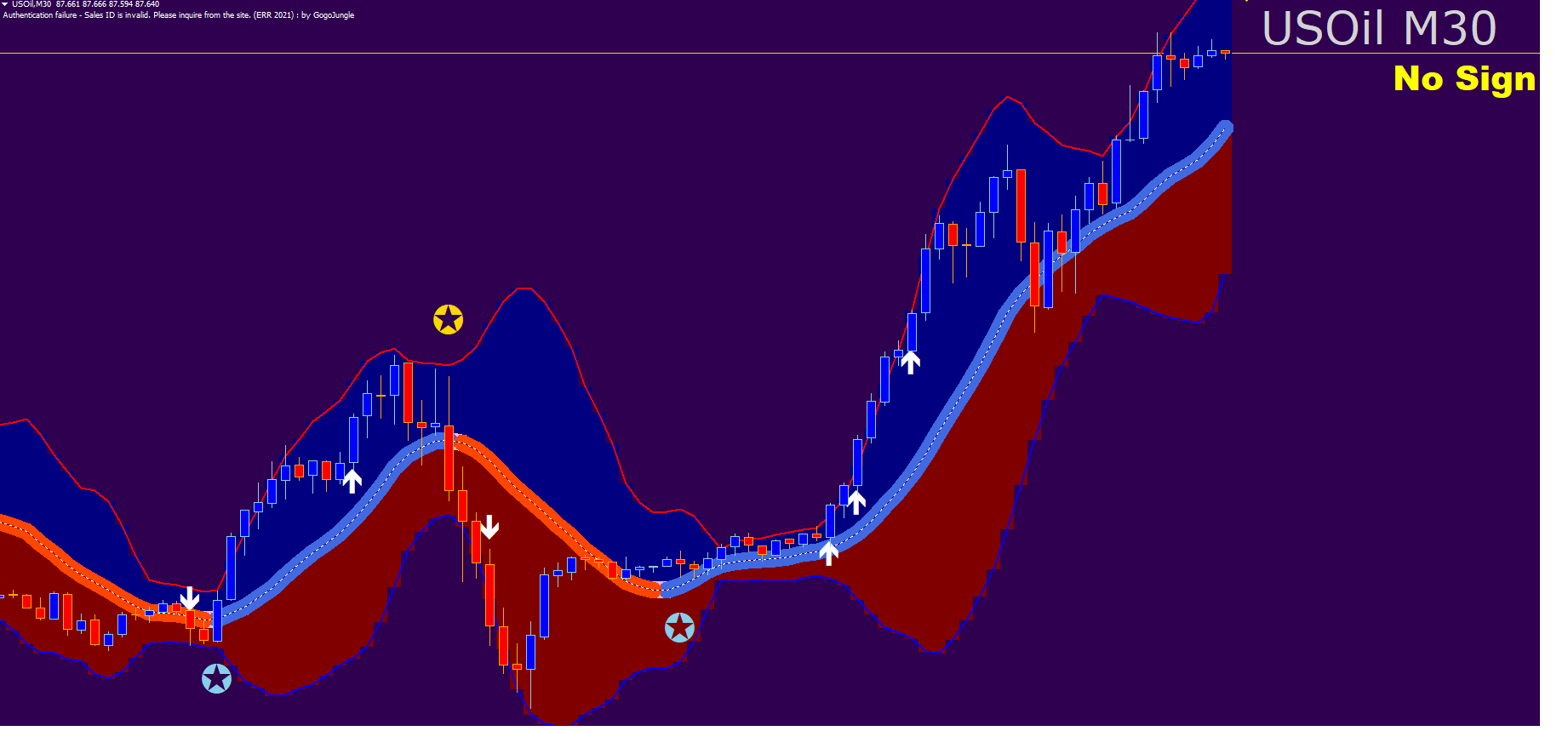 ・ バイナリーは、とても簡単です。色付きボリンジャーバンドの青色圏に価格がある時はハイエントリーのみ、赤色圏に価格がある時はローエントリーのみとします。バイナリー用の最適値にこのパラメータが設定してありますので、これを守って取引するだけでも十分勝ち越せると思います。 ・ さらに勝率を上げることを目指すなら、星印が表示された方向に、白い矢印が表示されたらエントリーチャンスとなります。ただし、サイン発生後一旦逆方向に引き戻されて、再度サイン方向に動き始めたタイミング(バイナリーの基本)でエントリーします。(全体的な流れはこのタイミングですが、一歩踏み込んで、サインが出た次のローソク足で、サインの方向に動き始めたタイミングでエントリーするのも勝率を上げる良い方法です。)