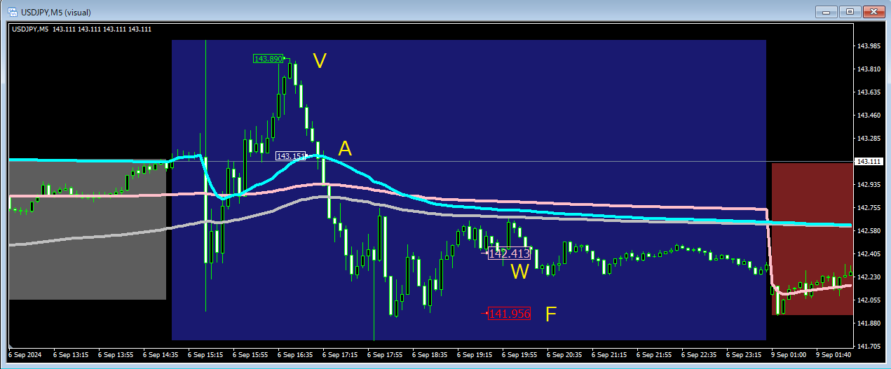 そうしますと下図のようになって V に対応するフィボナッチ比の F の付近で反転しているのが観察されます。W は等幅の下振れの場合の価格位置でトレンドがない場合はそのあたりで止まります。