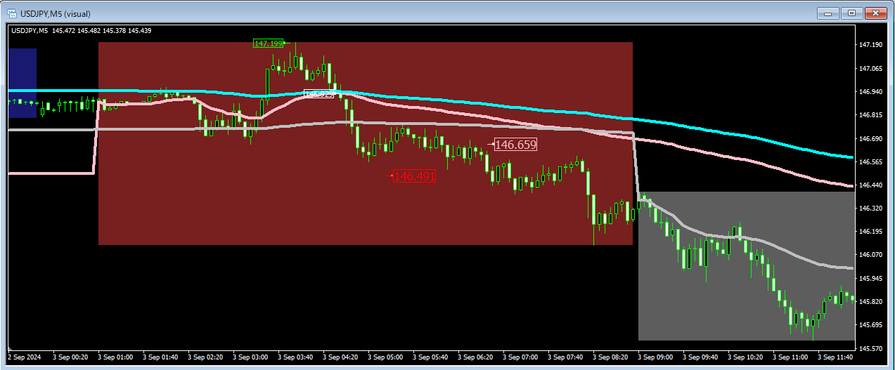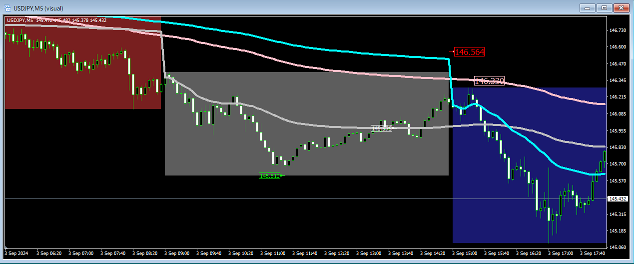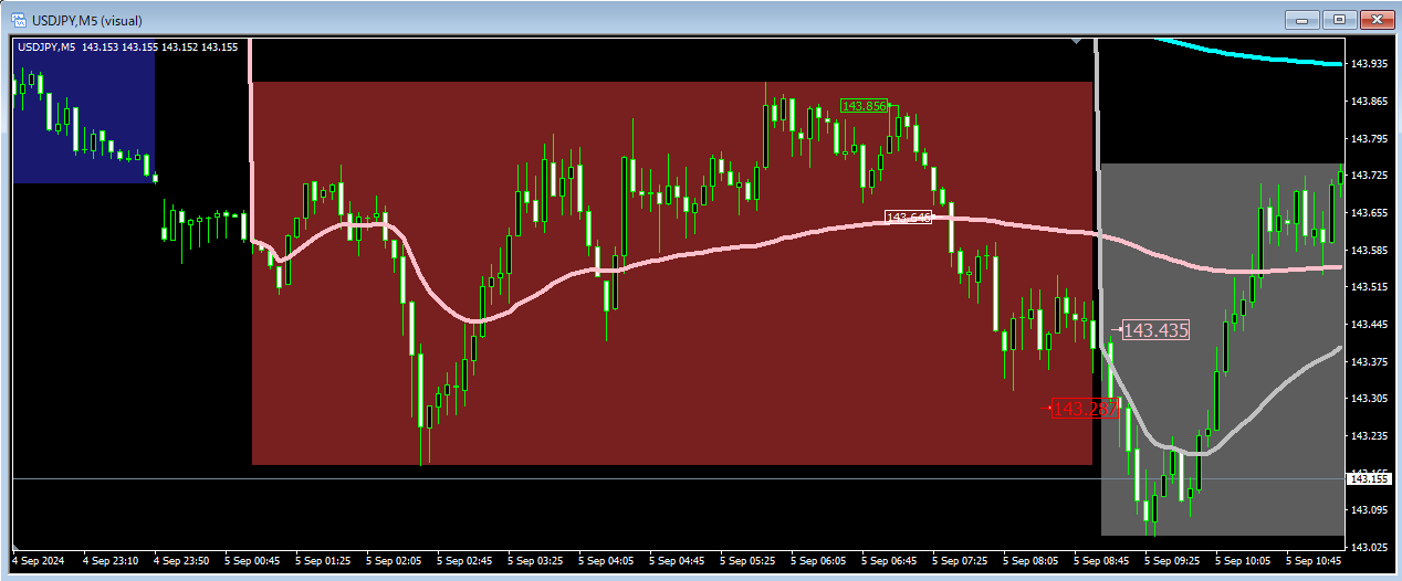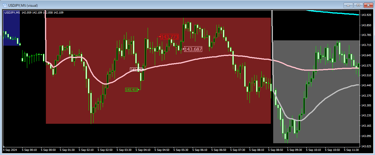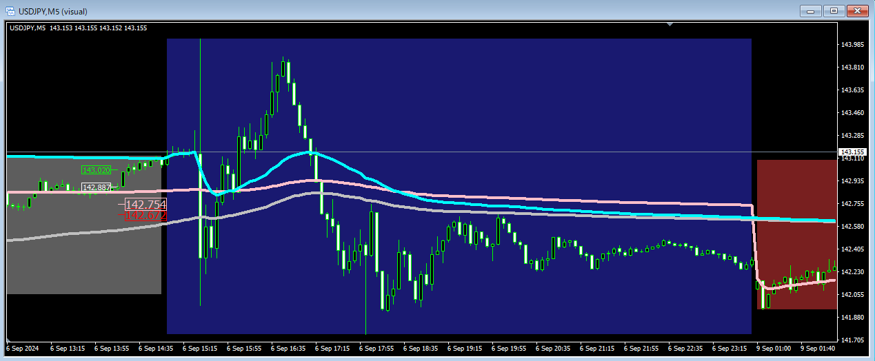 市場が始まった直後は売買量は多いのですがポジションの蓄積が少ないので市場 VWAP の有意性は小さくオーバーシュートも大きくなります。市場の後半で等幅の振幅を超えた場合はその方向へのトレンドがあると判断することができます。