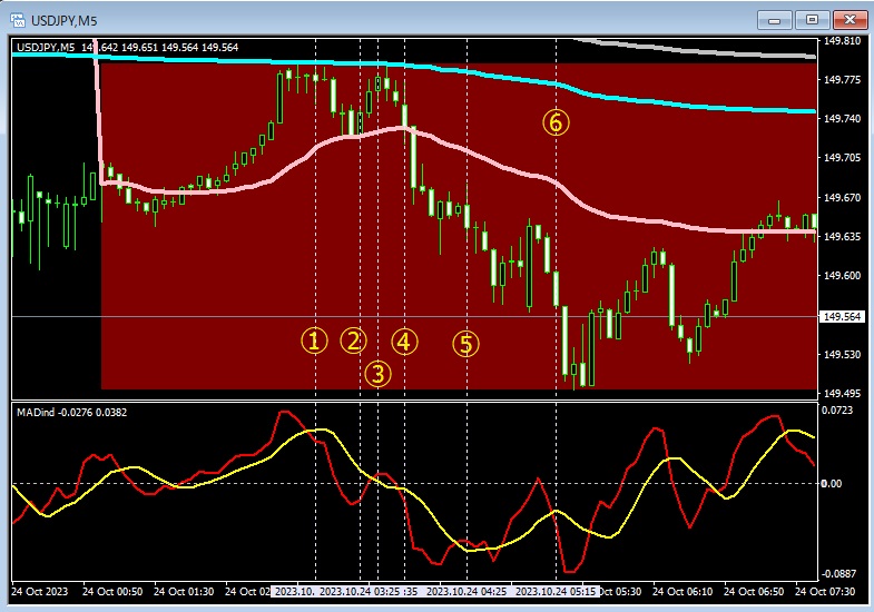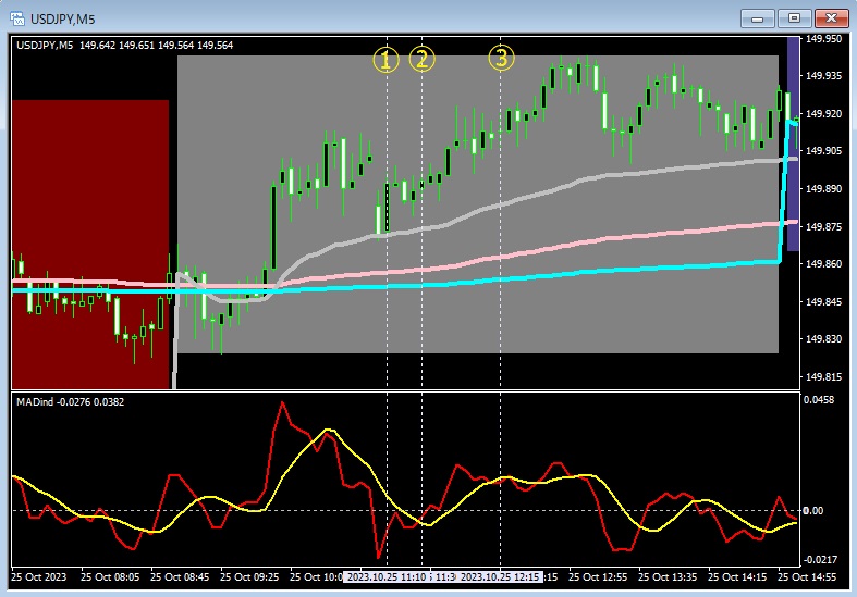 ①で当該市場 VWAP での反発が観察されます。しかし直ちに買いエントリーはその前のボラティリティーの高い値動きから見て危険です。MADind の買いシグナル②で買い、売りシグナル③で決済するようなトレードが考えられます。