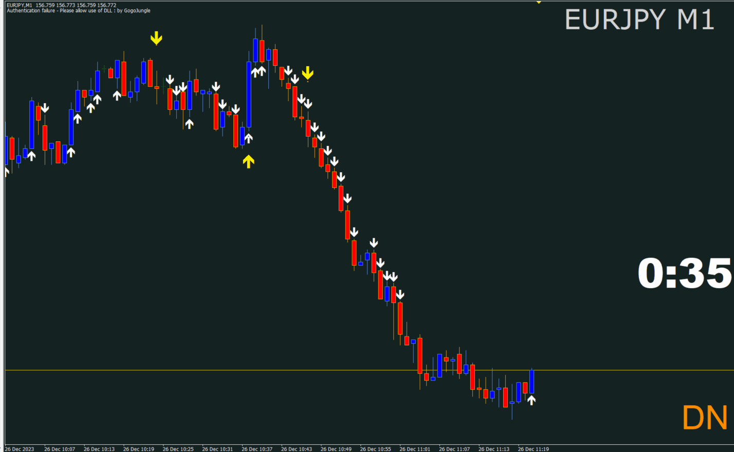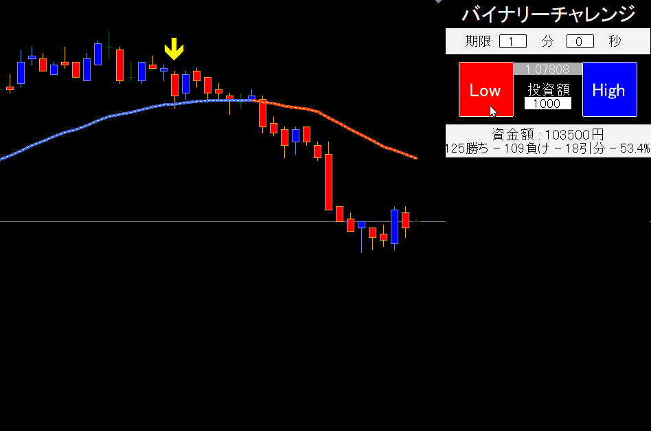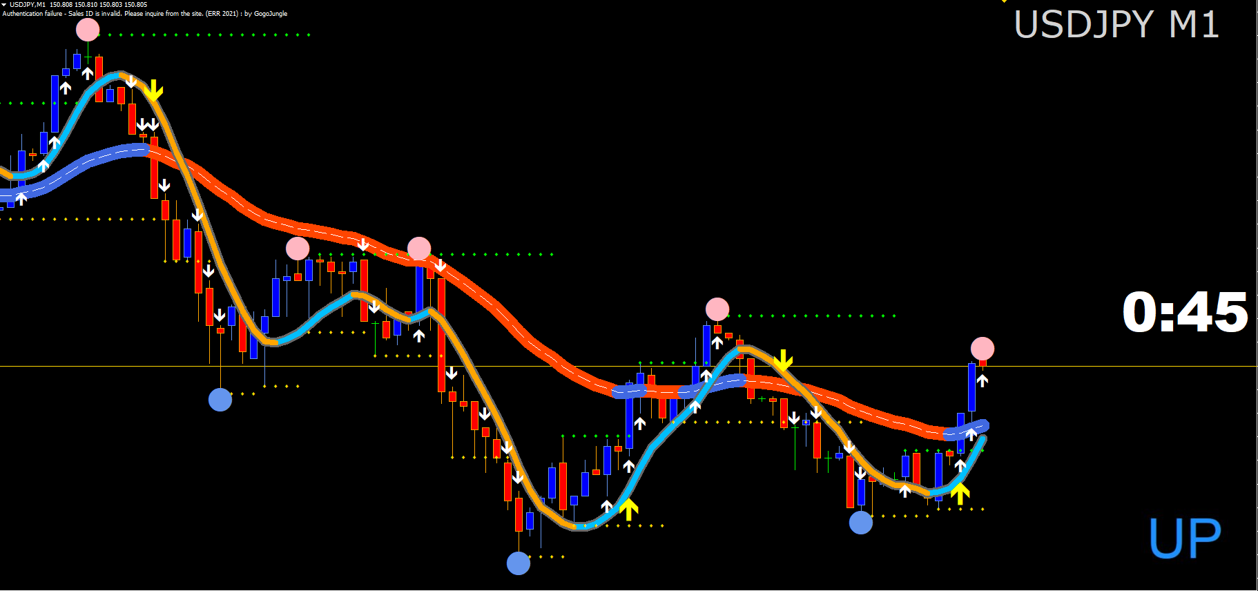 ☟サインの出方の参考画像 (1分足残り45秒で矢印が表示されている場面)