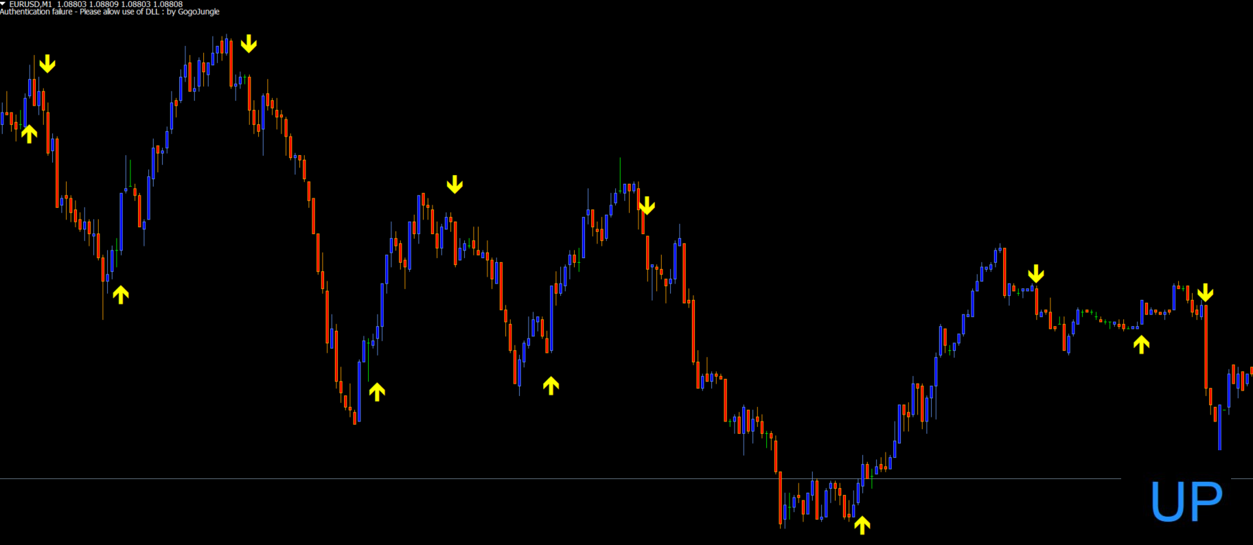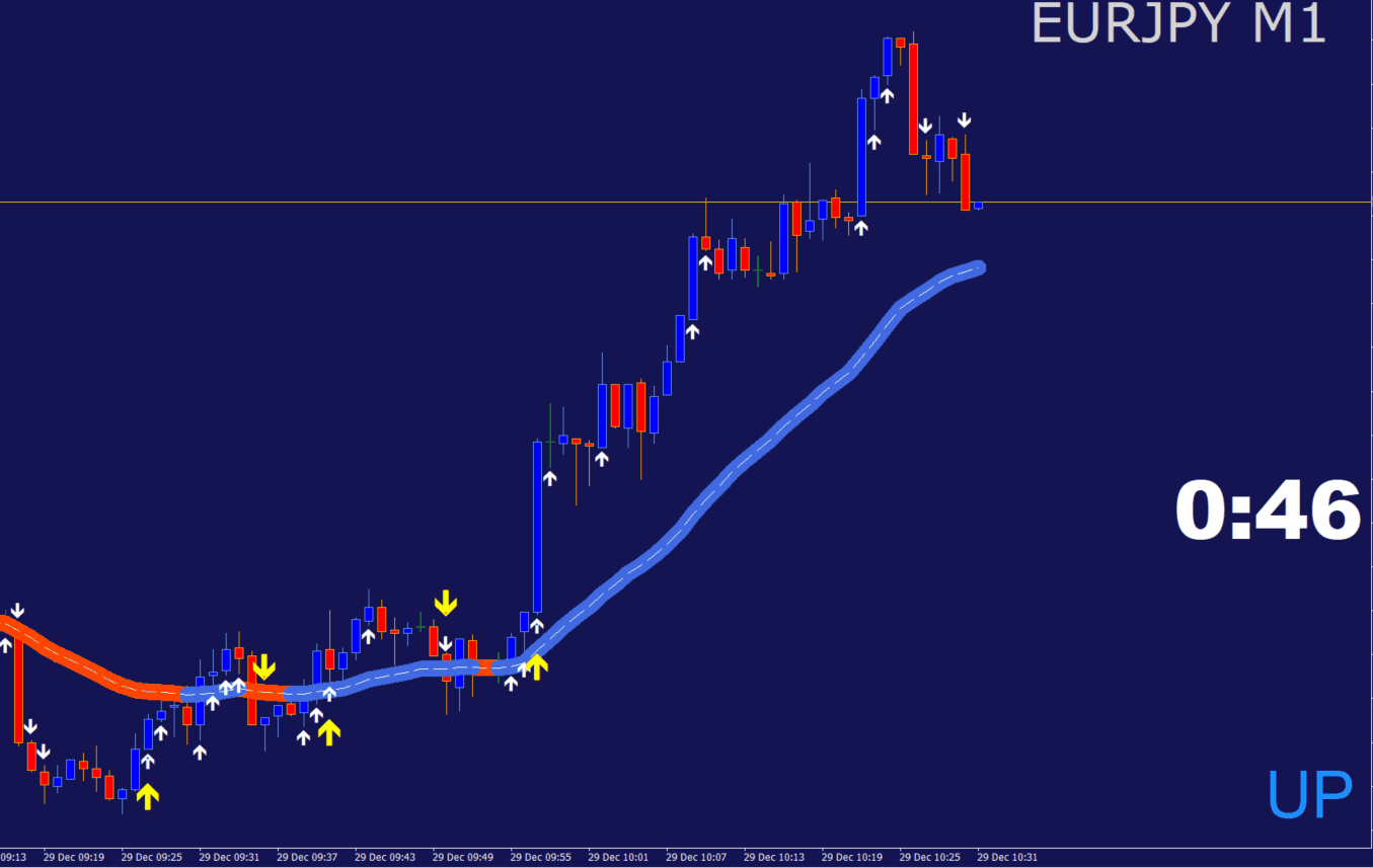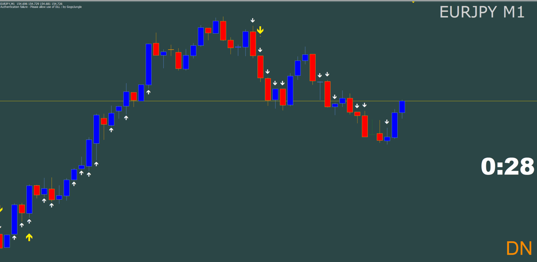 ☟サインの出方の参考画像 (1分足残り45秒で矢印が表示されている場面)