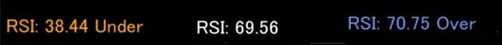※ RSIテキストは、チャート画面の左上に上の3例のいずれかの状態で表示されます。(70.40で設定例、変更可)