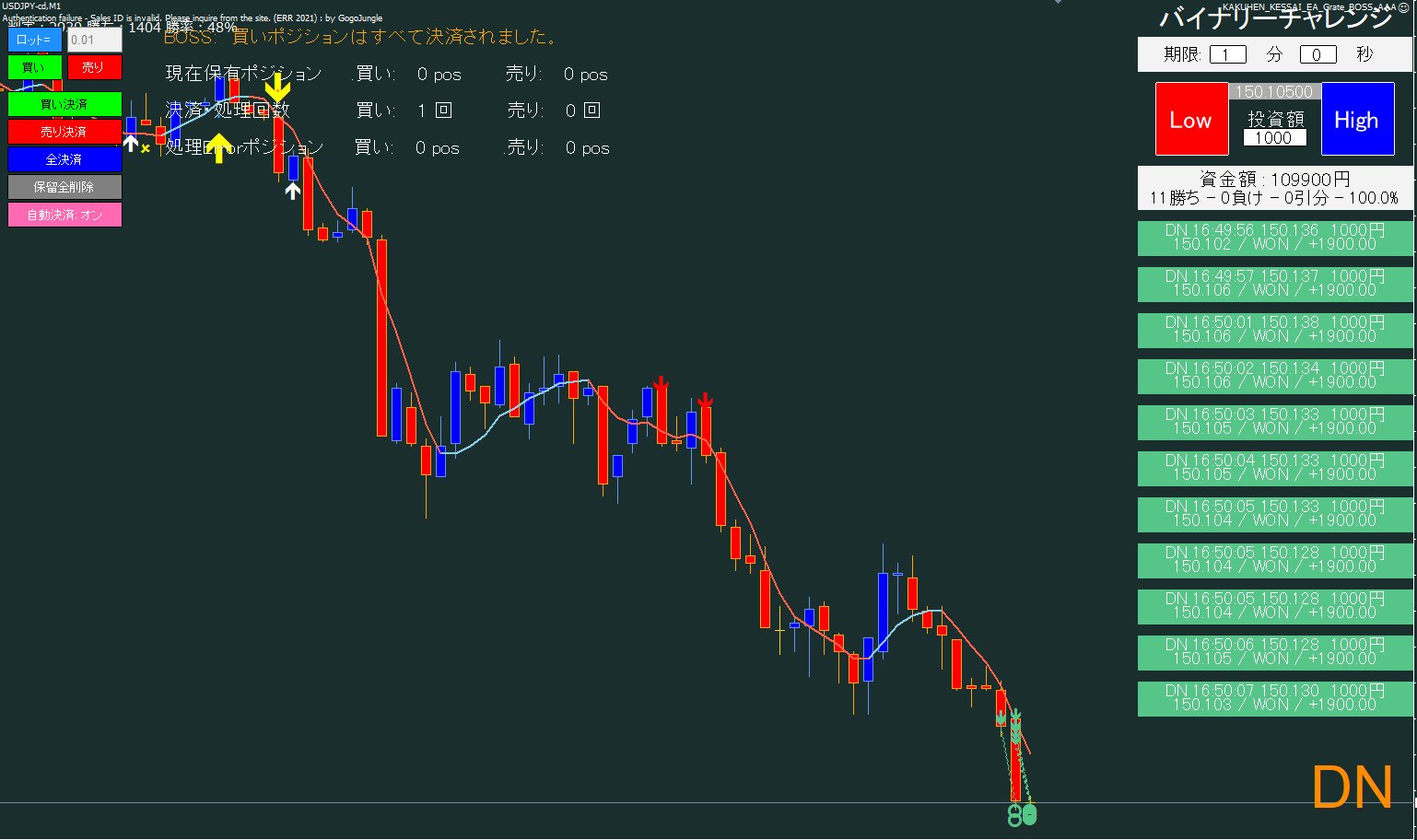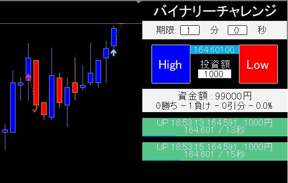 ★ バイナリーチャレンジのテスト運転(勝ってる時は緑の帯、負けてる時は赤い帯になります。