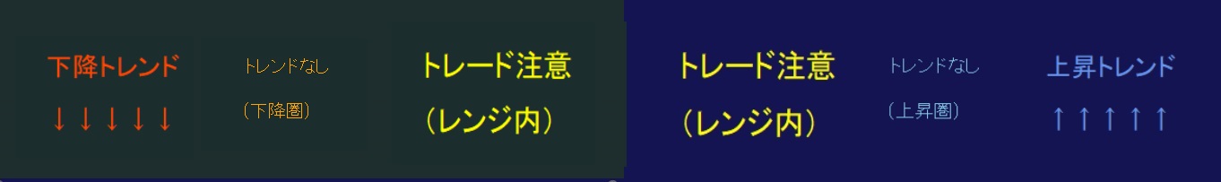 5段階6パターンあります。レンジの時やトレンドの時は文字のサイズ(レンジで最大になる)や色も変化します。