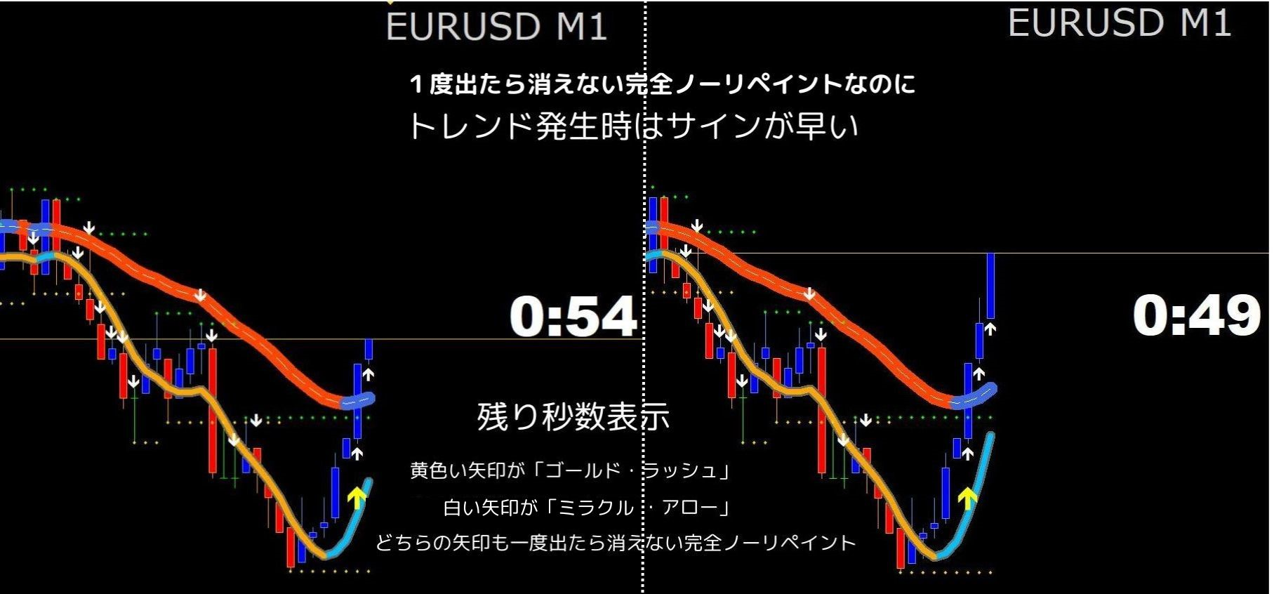 従来から出品している「マイ・エンジェル」と「ミラクル・アロー」の1番の違いは、トレンド発生時に「ミラクル・アロー」の方がローソク足1本ほどサインが早く出ることと、同じローソク足でのサインがより早く出ることです。ローソク足開始後1分足では数秒で出ることもあり、値が伸びる前にサインが出ることが多いのが特徴です。また、サイン数も多く、全体的な精度も上がっています。1度出た矢印サインは、インジケータを削除しても消えない頑固なノーリペイント仕様ですので、稼動画面で表示された結果は確かなものです。