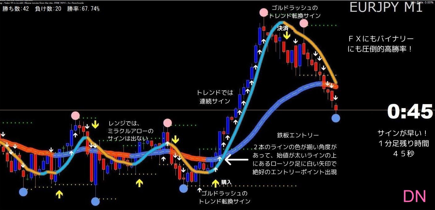 ①2本のラインの色が揃って、②その方向に「ゴールド・ラッシュ」の黄色の大矢印が出て、③同じ方向に「ミラクル・アロー」の白い小矢印が出たら、④同方向に動き始めたタイミングで、エントリーします。