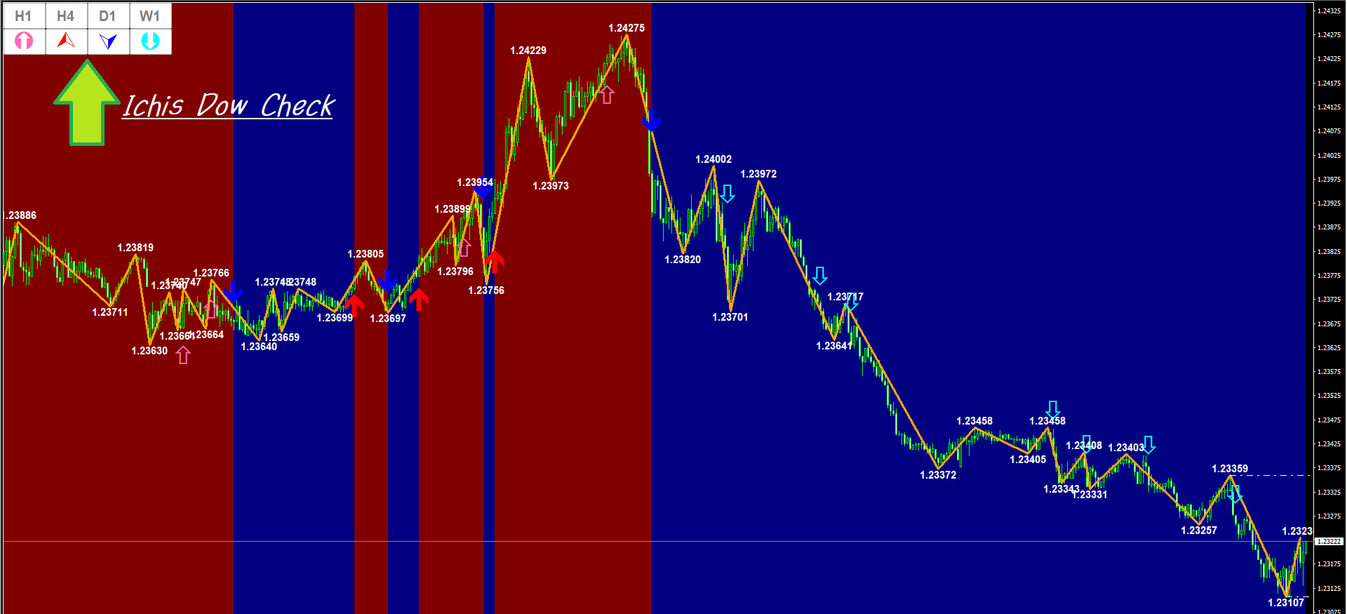 最大4つのMTF対応!ZigZagを利用してダウカウントを行い他時間足のダウ状況をチャートに表示させるインジケーターです。 (上記画像のチャート左上がIchis DowCheckです) 性能はできるだけシンプルに。設定画面は日本語表記にすることでインディケーター初心者でも扱いやすいようにしました。