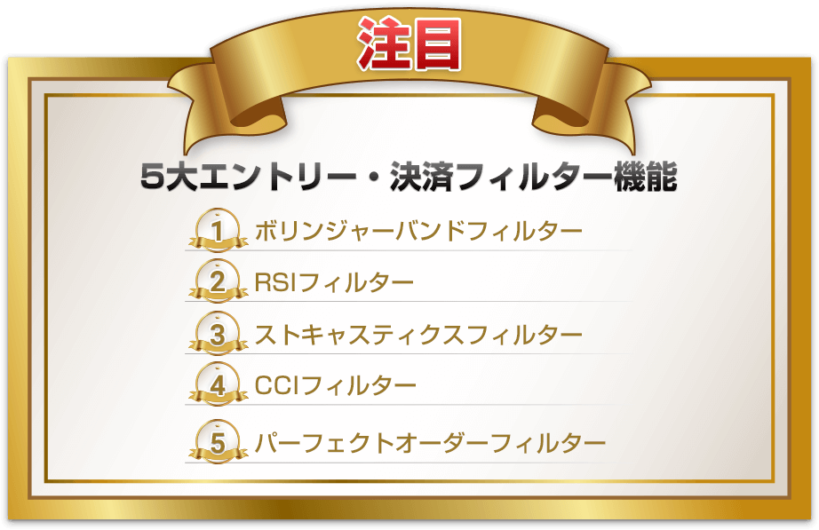 エントリー・決済時に上記5つのフィルターを付けられる機能。