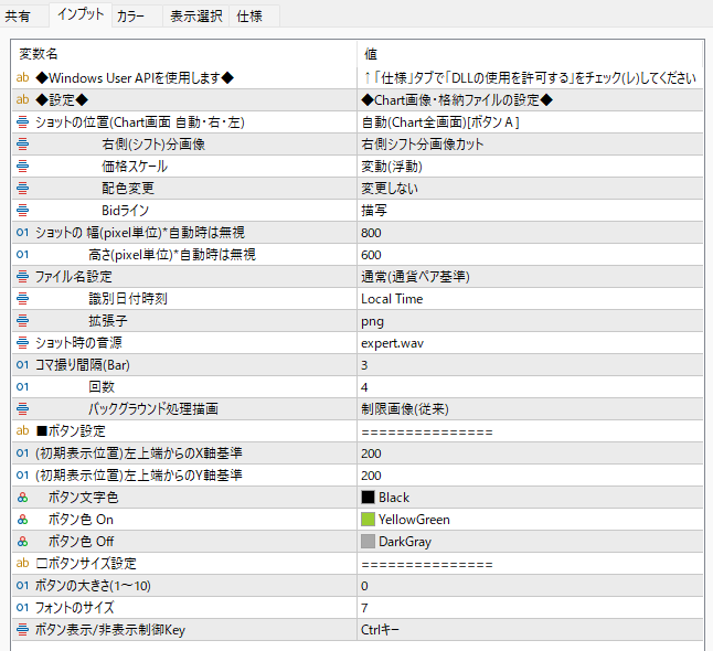 ※当インジケータ実行時には、「インプット」タブの横にある「仕様」タブの 「DLLの使用を許可する」にチェックを忘れずに入れて下さい。