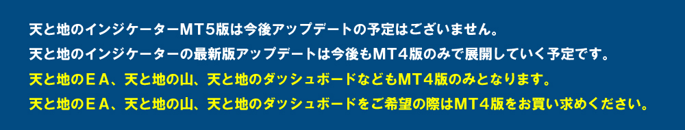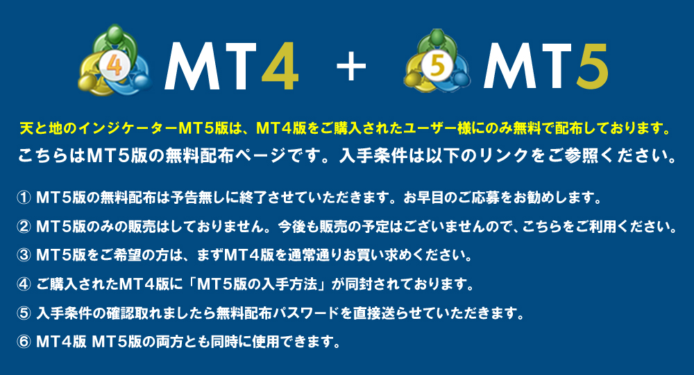2800本以上の販売実績を誇る「天と地のインジケーター」のMT5版が遂に完成!待望の完全移植!既にMT4版をお持ちでもMT5版を併せ持つ事で備わった技術は無駄にならず一生安泰です。
