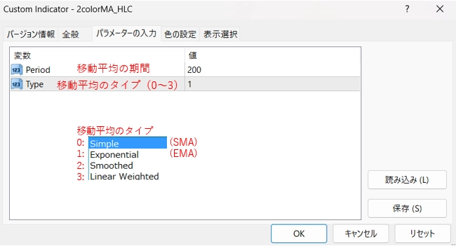 御自身で、移動平均線の期間やタイプを設定可能です。