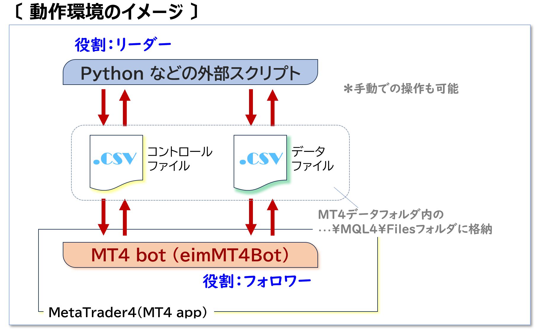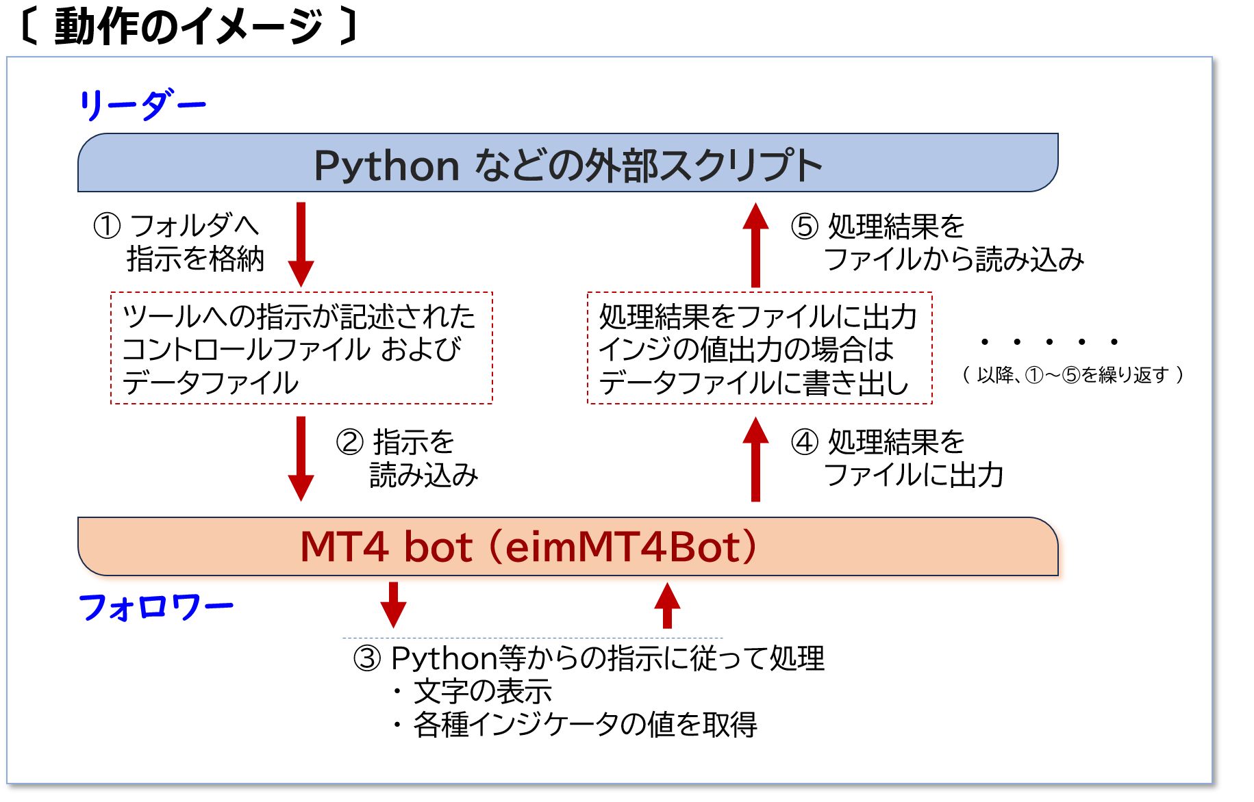”Pythonと連携する”と うたっていますが、Pythonに限らず 一般的な外部アプリの利用が可能です。MT4の外部にあるアプリやスクリプトから、MT4を操作するためのツール(=bot)となります。