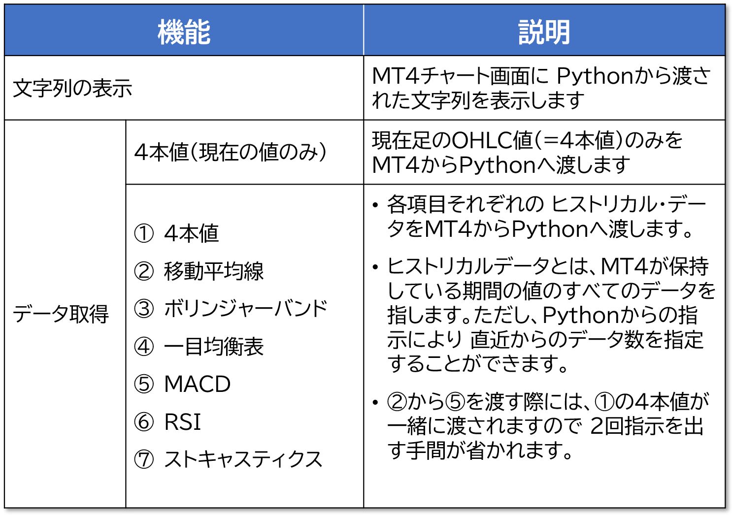 このツールでは 高度な知識を必要とせず MT4とPython間での連携を実現させます。利用者はPython側のスクリプトをご用意いただくだけで、MT4側の以下の表の機能を利用することができます。