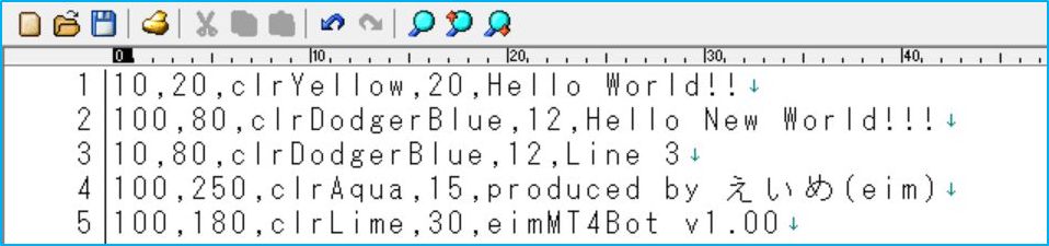 2つめは 指示の内容そのもので、「文字列を描画せよ」などの コマンドになります。具体的な指示の内容、ここでは文字列の描画方法は、データファイル(ファイル名: eimCsvExec_data.csv)に記述して相手(この場合はMT4側のツール)に渡します。具体的な内容は、描画位置(x,y座標)、文字サイズ、文字カラー、描画する文字列の5つを記載します。ファイル内の各行が1つの文字列の描画指示となり、現時点ではいくつでも、何行でも文字列の描画指示をだすことができます。