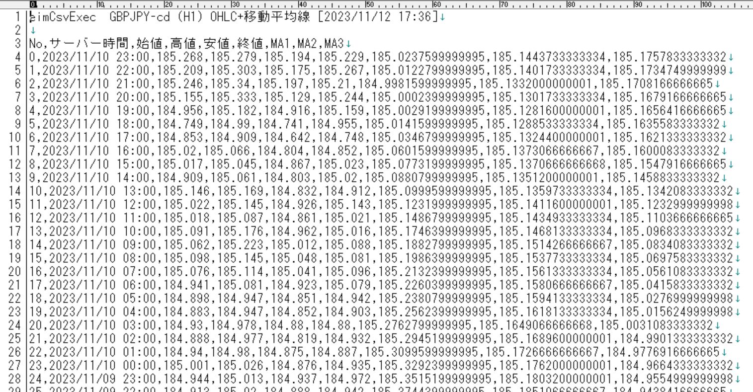 1行目には出力した情報が何であるのかを示すタイトル行です。(アプリ名は旧名称)3行目がカラム(項目)名となっています。データ数(=No)とサーバー時間に続いて、4本値(=OHLC)と、移動平均線を出力しています。4本値は いつも一緒に出力されます。