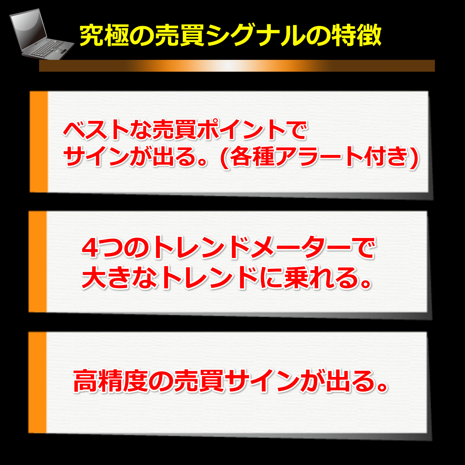 売買シグナルは、ベストなタイミングで出ます。サインのリペイントはありません。全時間足に対応しております。売買シグナルが出ましたら、ポップアップアラート、メール通知、スマホ通知があります。