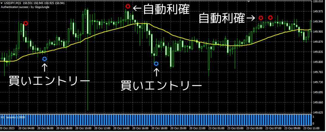 買いの青い★シグナルでエントリー、赤い★シグナルで自動決済となります