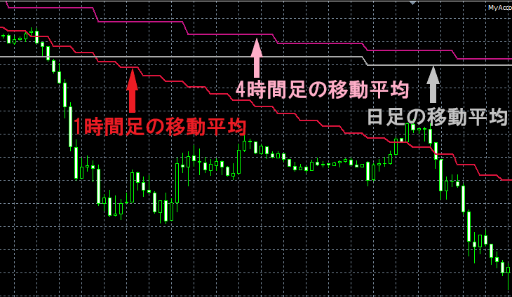 今回はお試し版として、各時間足に、1時間足と4時間足、日足の移動平均線を表示してみました。