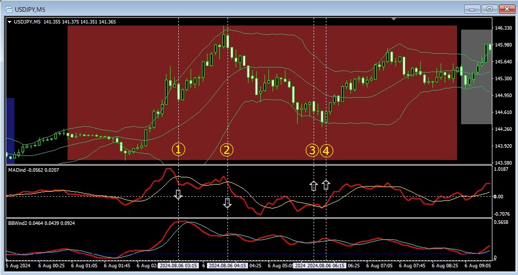 ④ と ⑤ の間のシグナルは大きなプルバックでの逆張りと見ることが出来ます。MADea による決済では損切りとなりますがその前に手動利確のチャンスはあります。⑥, ⑦ 間の二つのシグナルは短いバンドウォークに対する逆張りとプルバックに対する逆張りとみなすことが出来ます。これらも EA 決済では損切りとなりますがその前に手動利確のチャンスがあります。