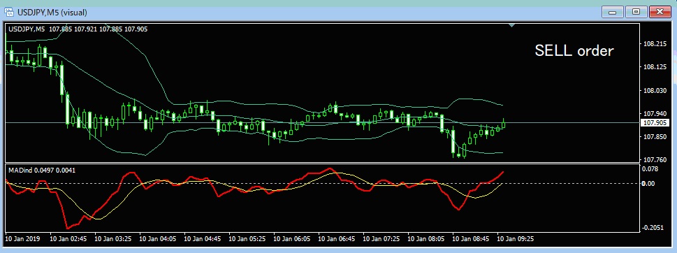 Sell_order スクリプトで売り注文を入れますと MAD がシグナルの上なので待機状態になり SELL order と右上に表示されます (下図)。