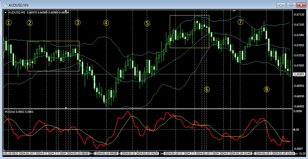 黄色の四角で囲った部分はトレンドがない状態でシグナル線の付近で MAD がふらつき、売買シグナルが多発します。このような状態でエントリーしますと最後の一回 (③, ⑥) を除き全て損切となってしまいます。つまりトレンドがない状態ではトレードしてはいけません。また ③, ⑥ が利確につながることは予見できませんから、少し動いたところで成り行きエントリーしなければならないことになります。