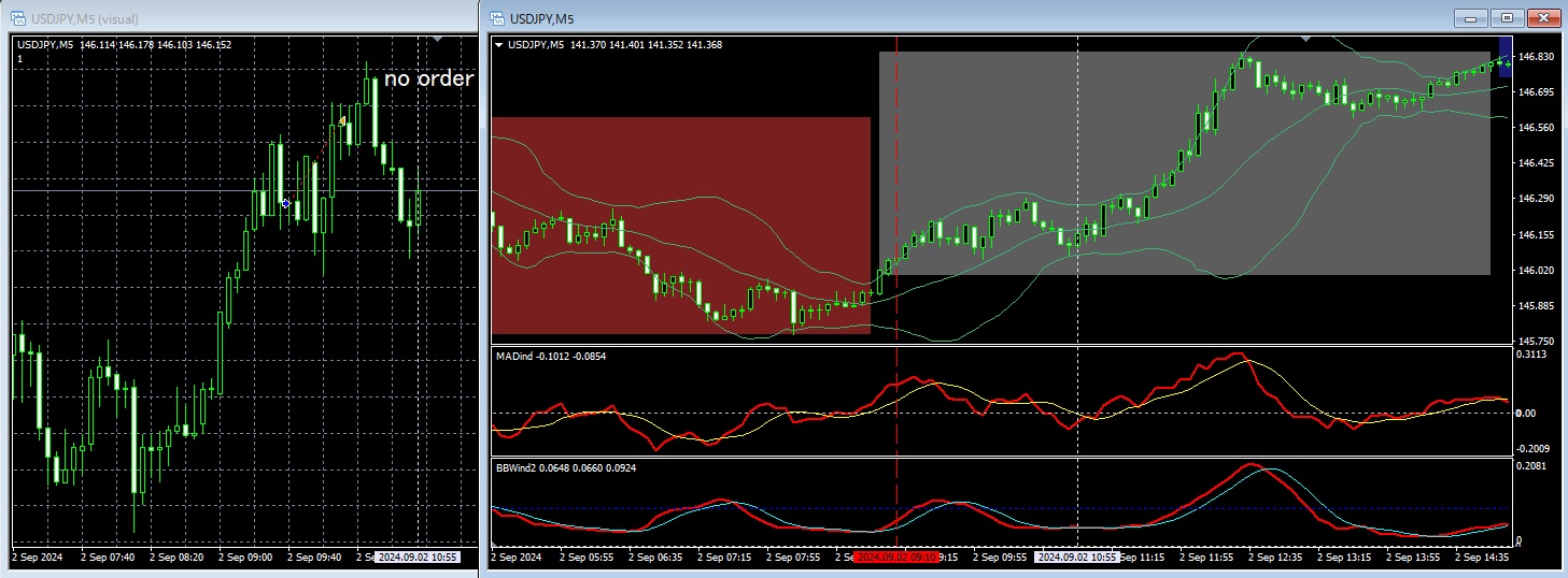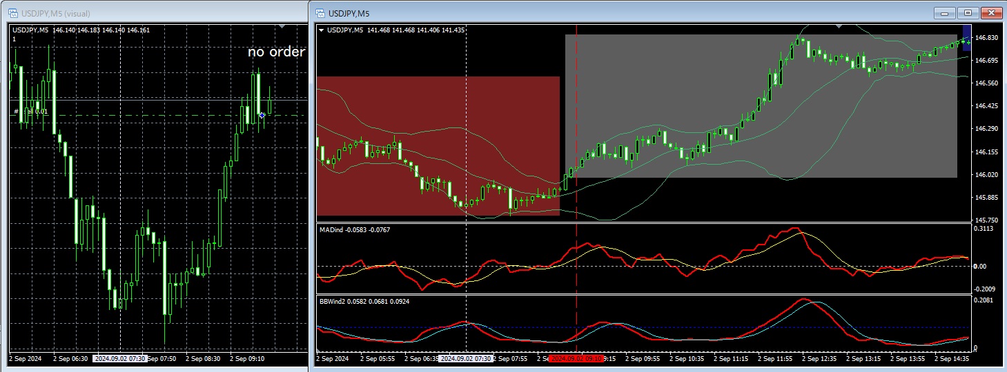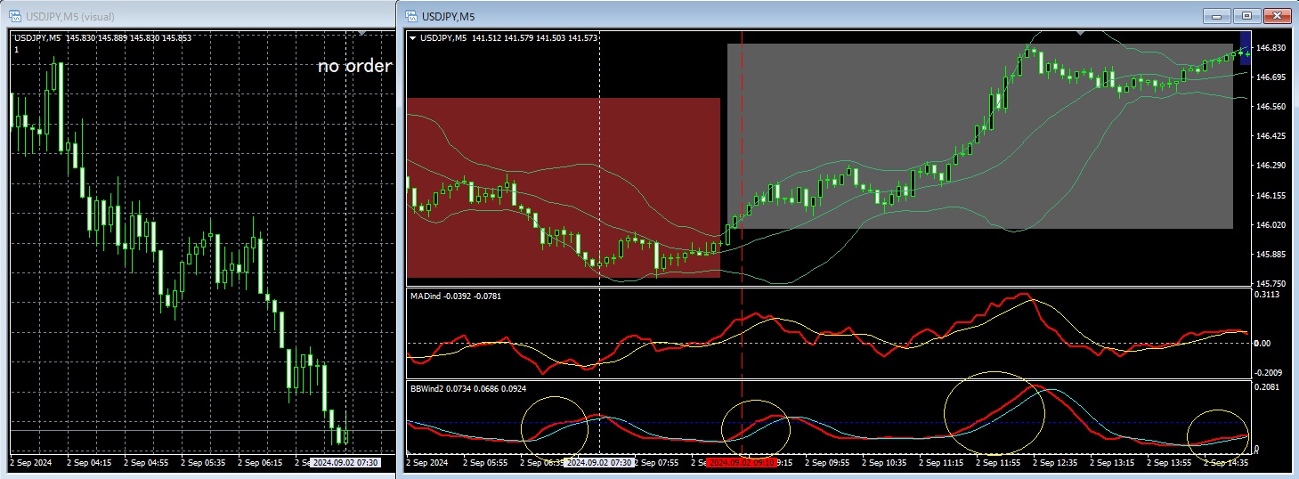 左はストラテジーテスターの 5 分足チャート、右はテクニカル分析の 5 分足チャートです。ストラテジーテスターを灰色点線のところで停止して右のチャートの灰色点線より先にあるエントリーポイントを探します。バンドウォークすなわち強いトレンドをトレードの前提条件とすることにします。バンドウォークはボリンジャーバンドの幅の拡大を伴いますのでボリンジャーバンドの幅のインディケータ BBWind を下のサブウィンドウに示しました。赤い線が上昇する丸印をつけたような箇所がエントリーポイントの候補となります。灰色点線の右側の最初の丸印の BBWind の上昇で逆張りのトレードをすることにします。MADind のシグナルクロスでトレードするためにはそれより前の適当なところにバックテスト用のスクリプト Sell_time_MAD をそこにドロップします。そうしますと赤の破線が出て一回目の売買の時刻と方向を指定することができます (買いの場合はスクリプト Buy_time_MAD で指定して緑の破線となります)。その後、ストラテジーテスターの停止を解除しますとチャートの展開が始まり Sell_time_MAD で指定した時刻に条件付き売り注文が有効となり、MADind のシグナルクロスを確認してから実行されます (下図)。