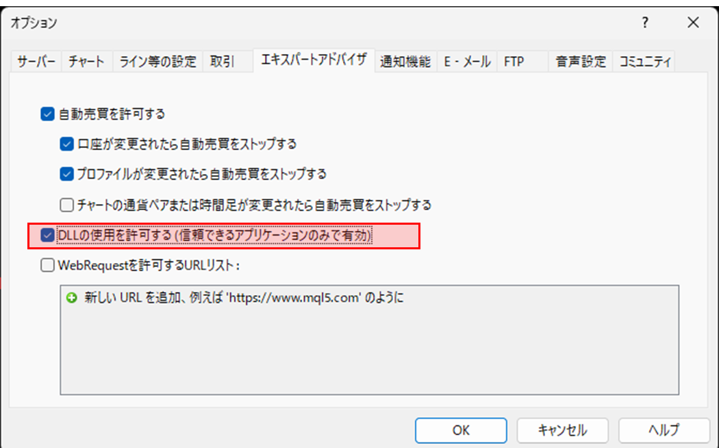 MTのメニューで、[ツール]-[オプション]からオプションダイアログを開いたら、エキスパートタブを選択して「DLLの使用を許可する」をチェックしてください。