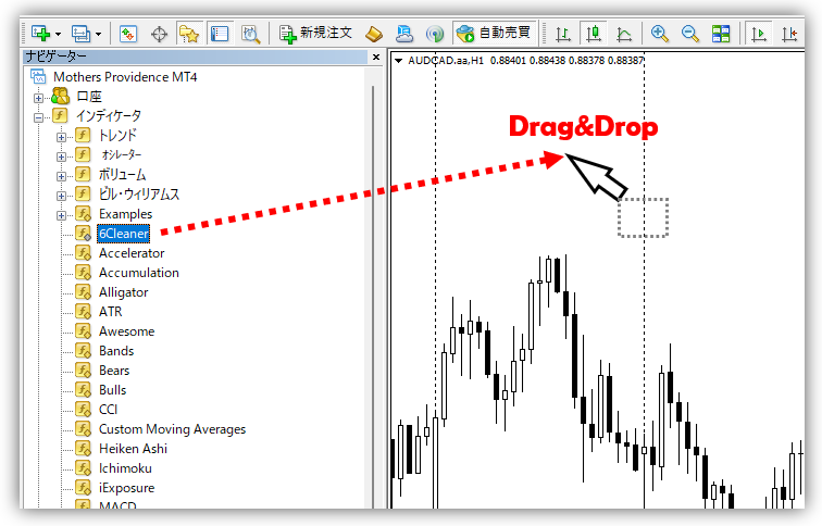 MTを再起動後に任意のチャートにインジケーター(6Cleaner)をドラッグ&ドロップして設置してください。