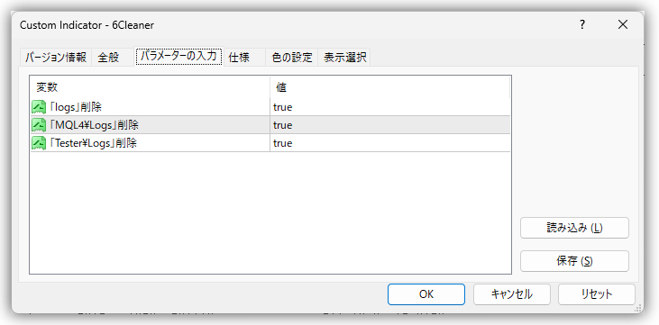 | 「Tester\Logs」削除 | 選択 | 「Tester\Logsフォルダ」のログフォルダを削除するかを指定する(true:削除する、false:削除しない) |