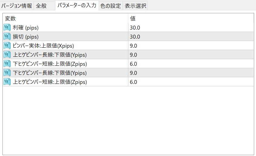 A.3 正常な動作です。過去チャートのサイン表示を確認したい場合は、ストラテジーテスターのバックテスト(ビジュアルモード)で動作を確認してください。 Q.4 ビジュアルモード(バックテスト)とリアル(ライブ)でサインが異なります A.4 バックテストでは過去のヒストリカルデータを使用しますが、リアルタイムのデータとは異なる場合があります。 ティックデータの違い等により、サインの発生が異なることがあります。 Q.5 利確(TP)/損切(SL)の値は変更できますか? A.5 はい。パラメータの TakeProfitPips(利確幅)と StopLossPips(損切幅)を任意のpips値に設定できます。 変更は新しく出るサインから適用されます(過去に出たサインの判定には遡って反映されません)。 Q.6 既定値(初期設定)は? A.6 初期値は 利確 30 pips / 損切 30 pips です。 相場のボラティリティや銘柄特性に合わせて、必要に応じて調整してください。