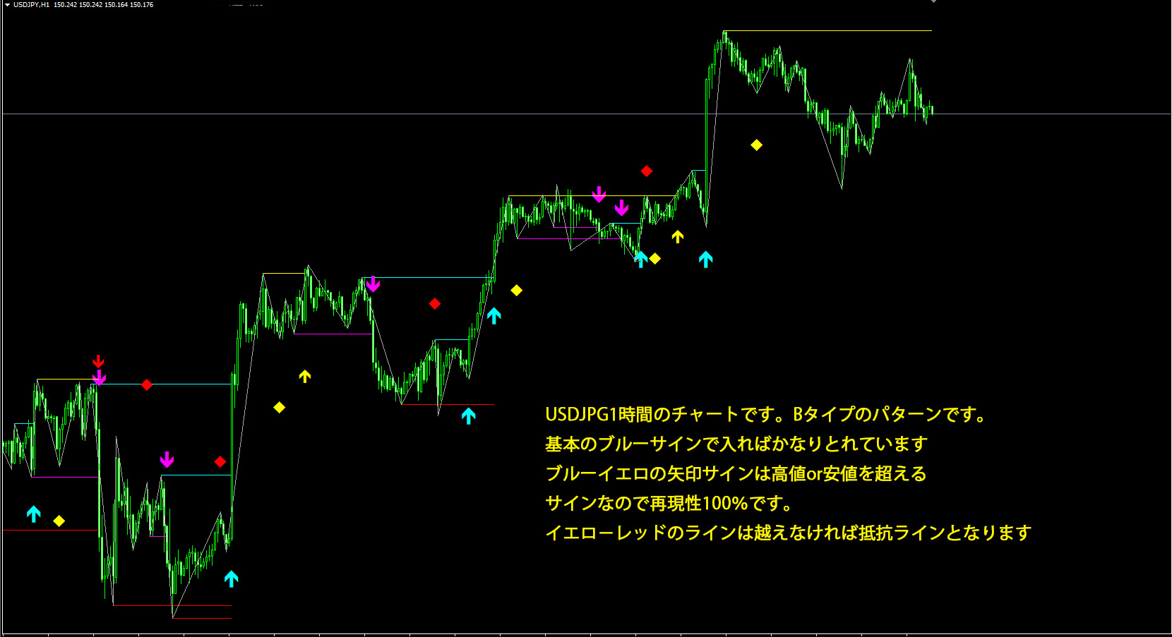 Aタイプは安値を切り上げて高値を切り上げるときにブルーラインが出るのでブルーラインを越えるブルーサインでエントリーです。 Bタイプは高値切り上げの時にブルーライン出てまだ安値は切り上げていませんが、この高値切り上げが戻り高値のラインになるのでこちらも ブルーサインでエントリーが可能です。 黄色サインは転換確定でどんどん伸びていくので黄色越えていくときももちろんエントリー可能です。