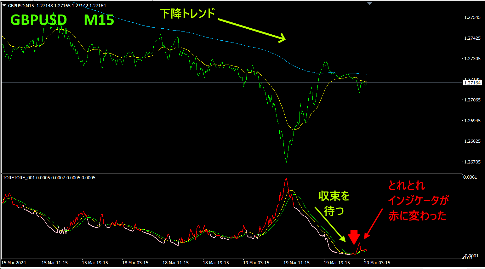 サブウィンドウに表示した「とれとれインジケータ」が収束するまで待ちます。メイン線のカラーが桃色から赤色に変わり、大底から反転上昇してきました。ここで、売りエントリーします。