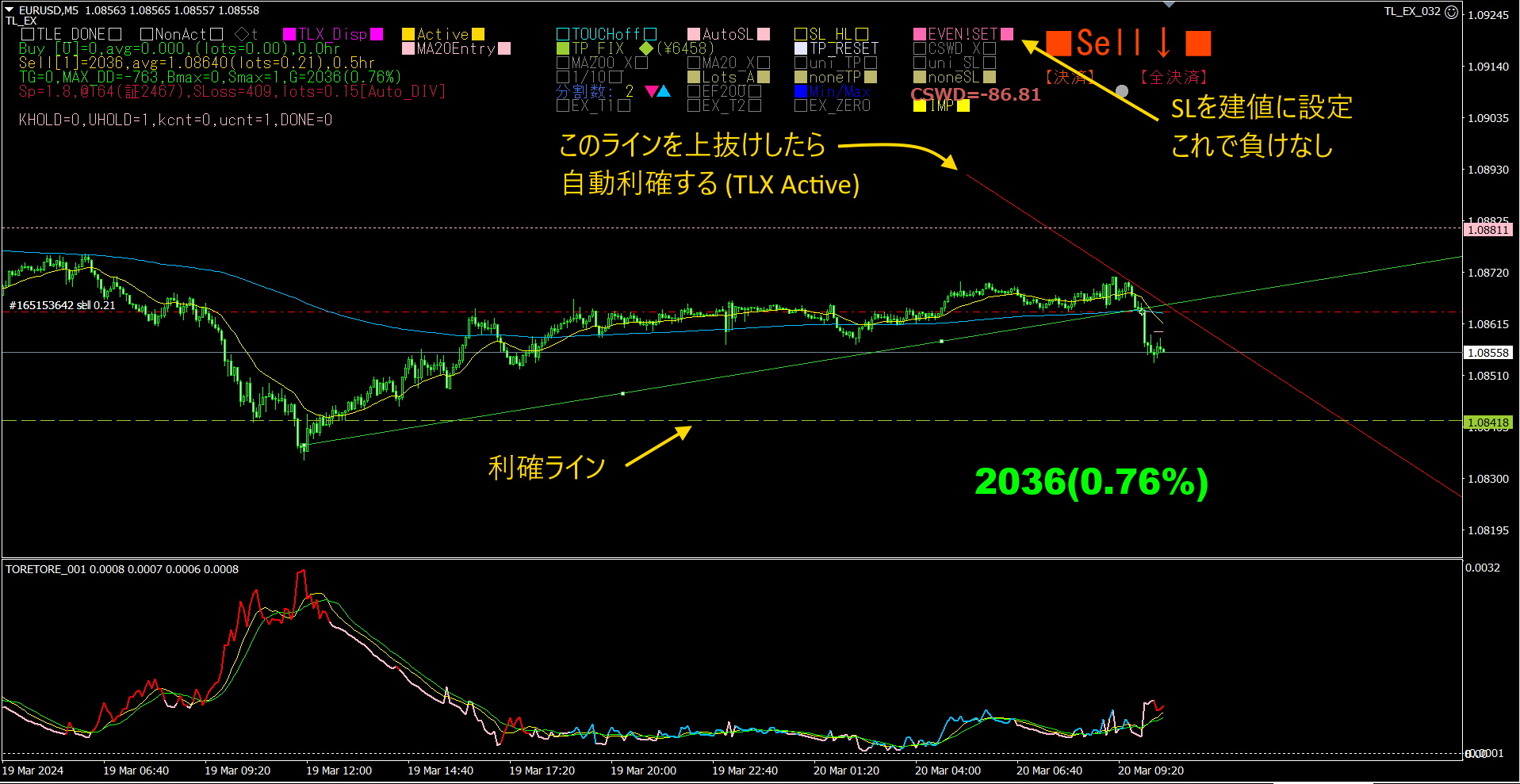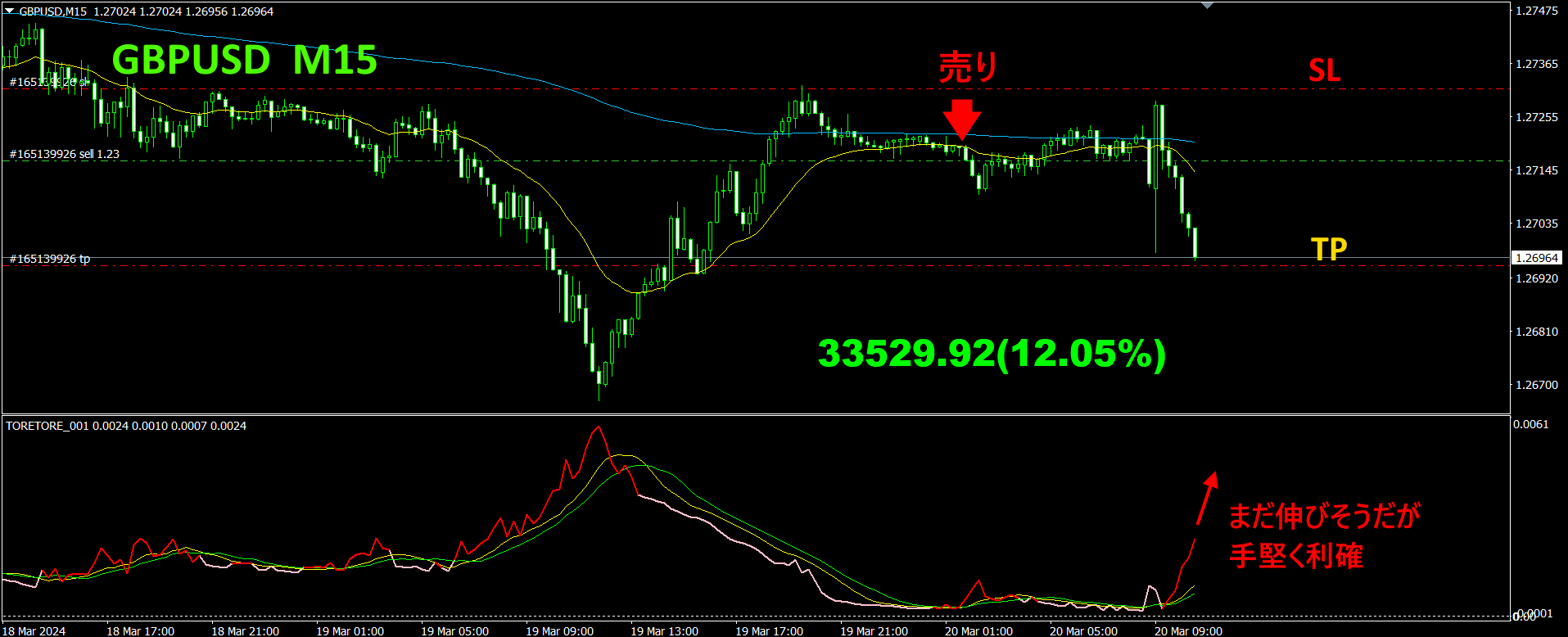 後は、TP(利確)ラインにタッチするか、斜めに引いたTLXラインにタッチすれば、自動的に決済されるので、放置しておくだけです。