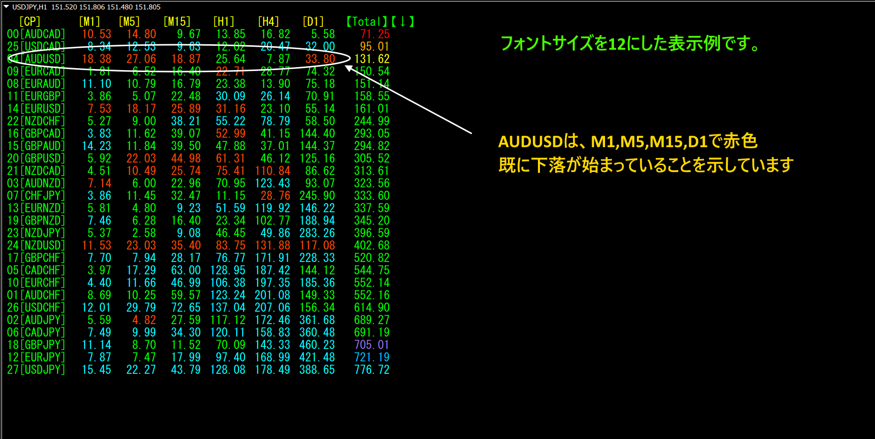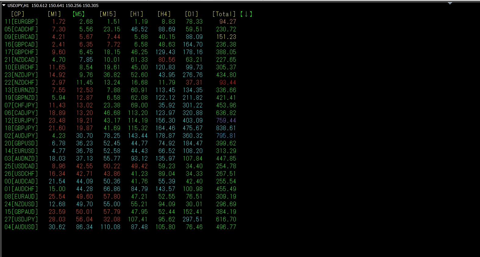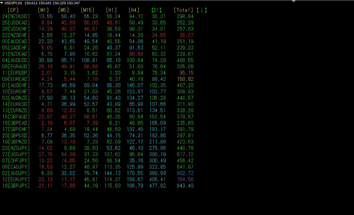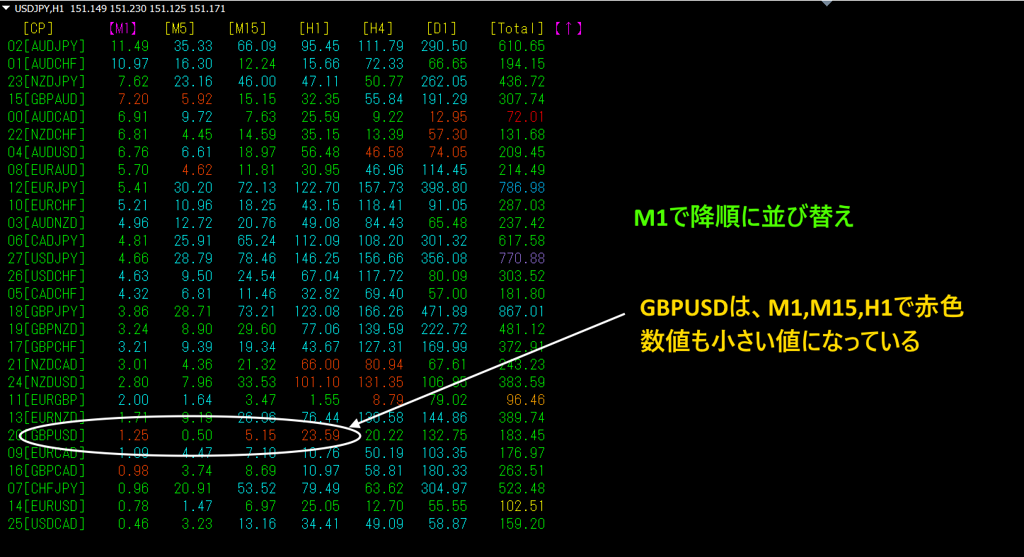 [M1]で降順に並び替えたものです。下から6行目のGBPUSDは、 [M1]~[H4]でかなり小さい数値になっています。[M1][M15][H1]で、赤色表示になっています。