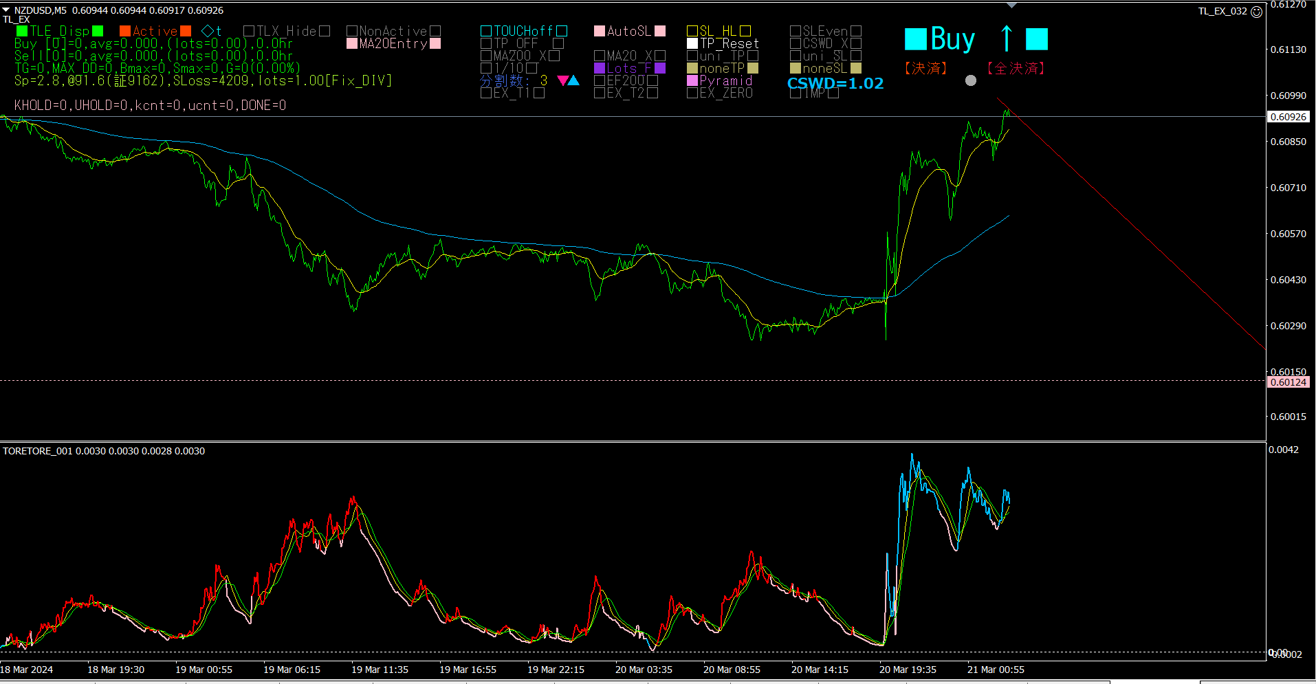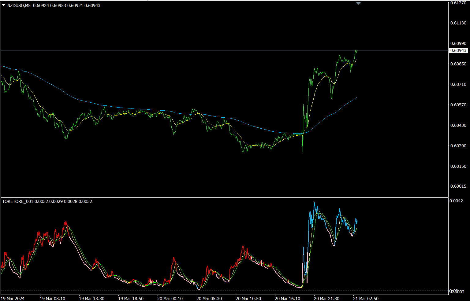 日足では、NZDUSDが最も収束しています。[M1]、[M5]、[M15]の数字が、青色になっているので、短期時間足では上昇トレンドが発生しています。少しで出遅れ気味かもしれませんが、NZDUSDの5分足で買いトレードを行ってみることにします。