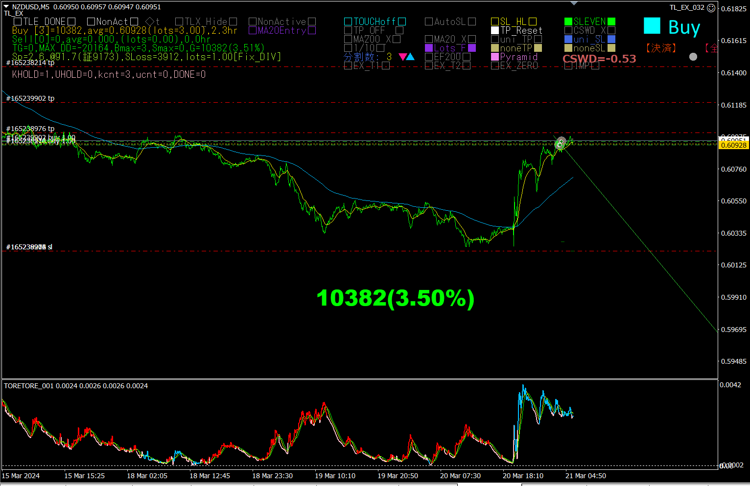 その後、順調に上に伸びてきました。自動分割エントリーが3本とも動作して、買いポジションのロット数が3.00になりました。含み益が\10,382出ているので、欲張って3本のTPを、直近安値、一つ前の直近安値、もう一つ前の直近安値に設定し直しました。安全安心の為、SL建値設定もONにしておきます。